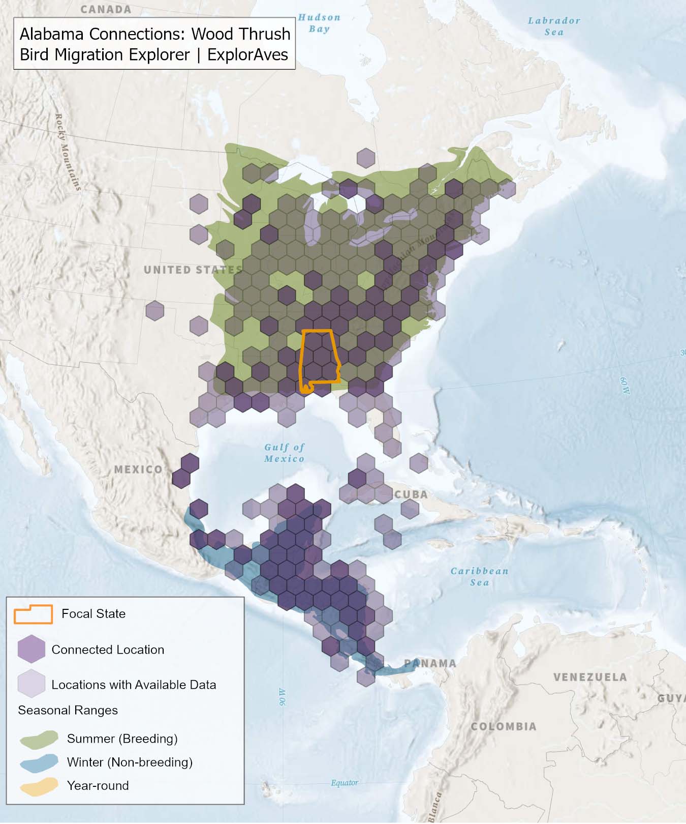 This map shows direct connections between Alabama and locations across the hemisphere based on available tagging data for individual Wood Thrush. Data were generously shared by researchers for the Bird Migration Explorer. The map displays the hexagons that are connected to the state (dark purple) as well as hexagons with available tagging data for the species (light purple) with no direct connections to the state. Explore more connections for Wood Thrush on the Bird Migration Explorer. Download map.