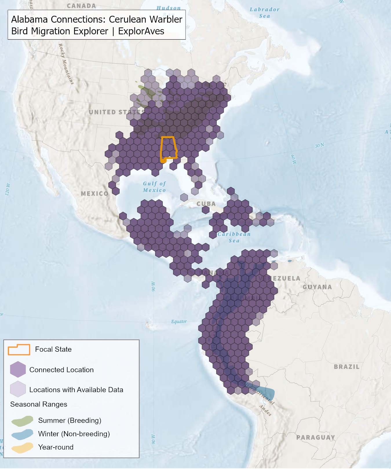 This map shows direct connections between Alabama and locations across the hemisphere based on available tagging data for individual Cerulean Warbler. Data were generously shared by researchers for the Bird Migration Explorer. The map displays the hexagons that are connected to the state (dark purple) as well as hexagons with available tagging data for the species (light purple) with no direct connections to the state. Explore more connections for Cerulean Warbler on the Bird Migration Explorer. Download map.