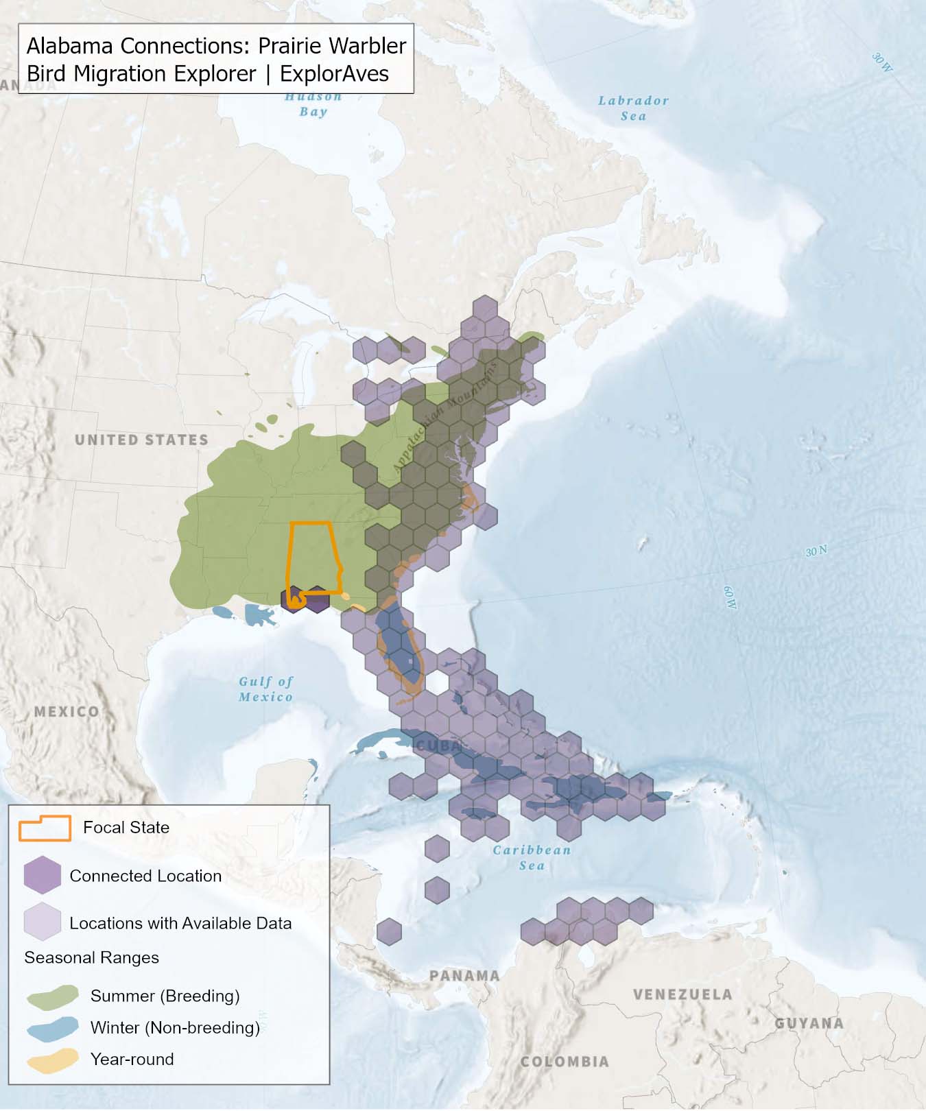 The species connection maps show direct connections between Alabama and locations across the Western Hemisphere based on tagging data in the Bird Migration Explorer available for each of the state’s migratory species of concern. Connections are based on bird band encounter records, automated radio telemetry, archival geolocators, satellite and GPS tracking, or genetic markers that document the movement of individual birds. The maps display locations (i.e., hexagons) that are connected to Alabama (polygon outlined orange) and illustrate the need to protect, restore, enhance and manage safe habitat in those areas to ensure species can satisfy their biological requirements across the full annual cycle. As individual birds travel between the species’ summer (breeding) and winter (stationary non-breeding) ranges, they traverse geopolitical boundaries, underscoring the need for collaborative and coordinated conservation efforts to maximize the return on conservation investments for the species in Alabama. While these maps offer valuable insight, they do not capture the complete picture of all connections, because they only present tagging data available in the Bird Migration Explorer. In some cases, species may not have a connection map, because no tagging data are available.