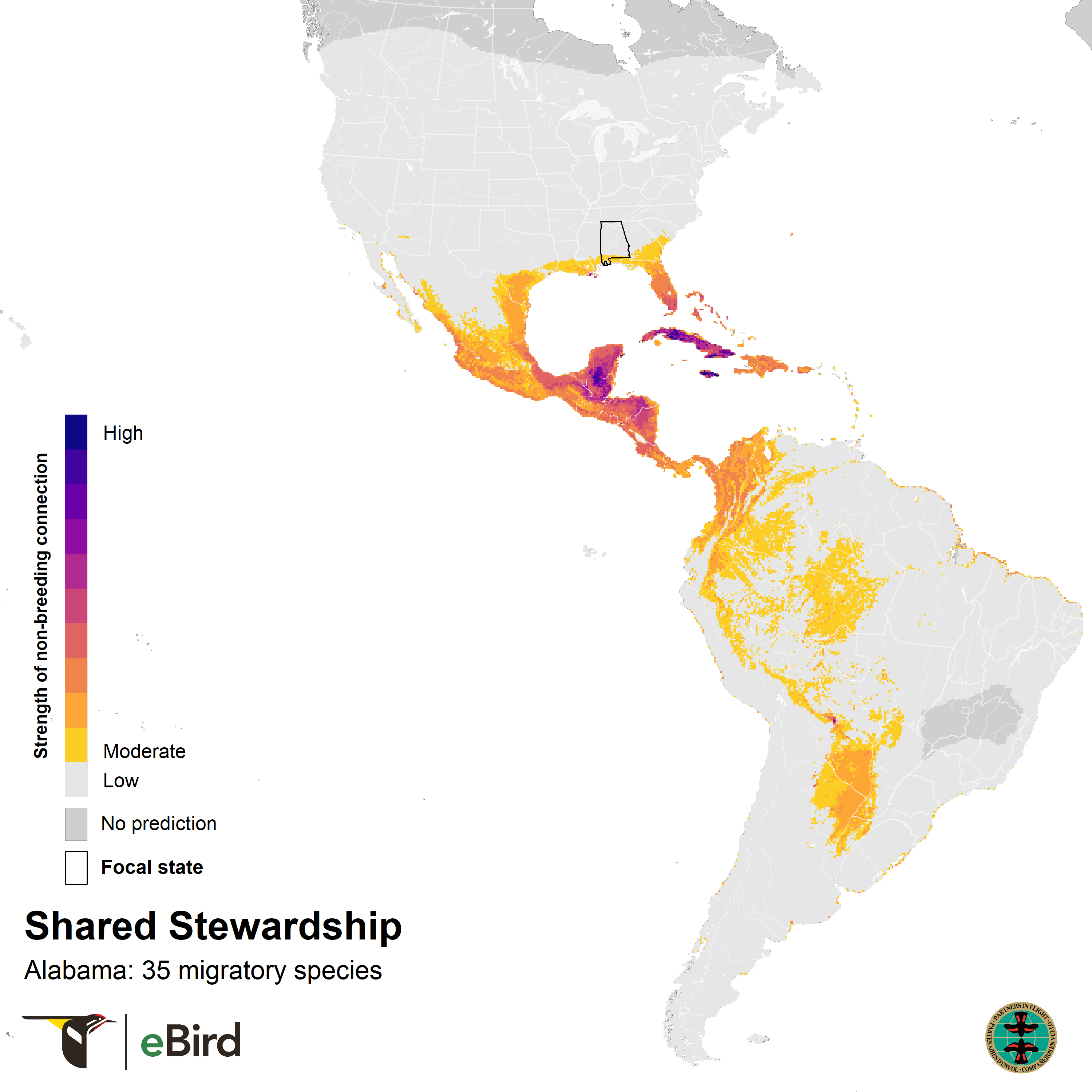 (1) A state-level overview of where the migratory birds that breed in Alabama are found during the non-breeding season based on Shared Stewardship Connection Maps.