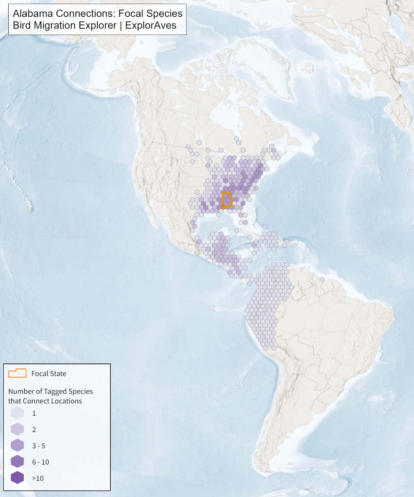 This map shows direct connections between Alabama and other locations across the Western Hemisphere based on tagging data available in the Bird Migration Explorer for the state’s migratory focal species. Connections are based on bird band encounter records, automated radio telemetry, archival geolocators, satellite and GPS tracking, or genetic markers that document the movement of individual birds. The map displays the number of migratory focal species that connect each location (hexagon) to Alabama. While these data offer valuable insight, they do not capture the complete picture of all connections because they only present available tagging data for the subset of species of concern identified by each state. The multi-species tagging connections map illustrates the need to protect, restore, enhance and manage safe habitat in locations connected to the state to ensure migratory species can access the resources they need across the full annual cycle. As individual birds travel between species’ summer (breeding) and winter (stationary non-breeding) ranges, they traverse geopolitical boundaries, underscoring the need for coordinated conservation efforts to maximize the return on conservation investments in Alabama. Additionally, multi-species connection maps illustrate Alabama's crucial role in safeguarding the migratory movements of these species.