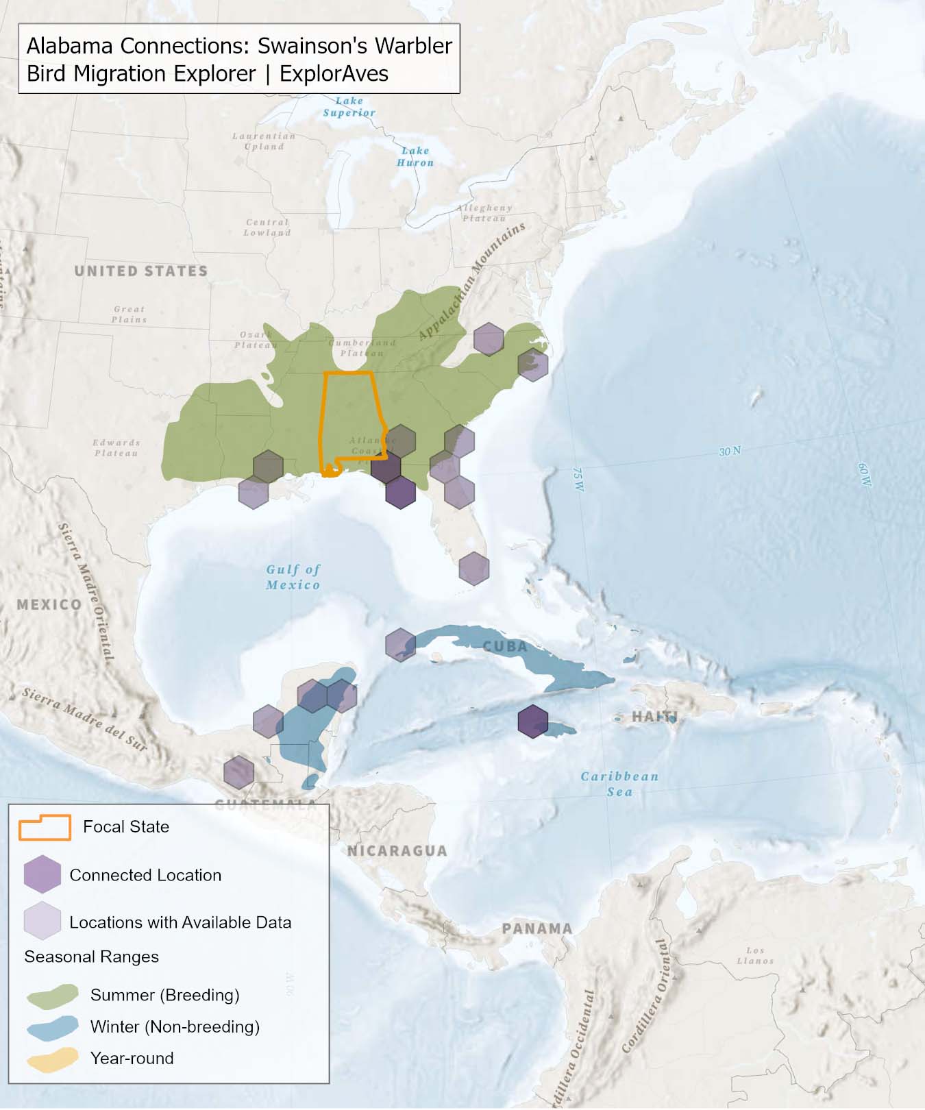 This map shows direct connections between Alabama and locations across the hemisphere based on available tagging data for individual Swainson’s Warbler. Data were generously shared by researchers for the Bird Migration Explorer. The map displays the hexagons that are connected to the state (dark purple) as well as hexagons with available tagging data for the species (light purple) with no direct connections to the state. Explore more connections for Swainson’s Warbler on the Bird Migration Explorer. Download map.