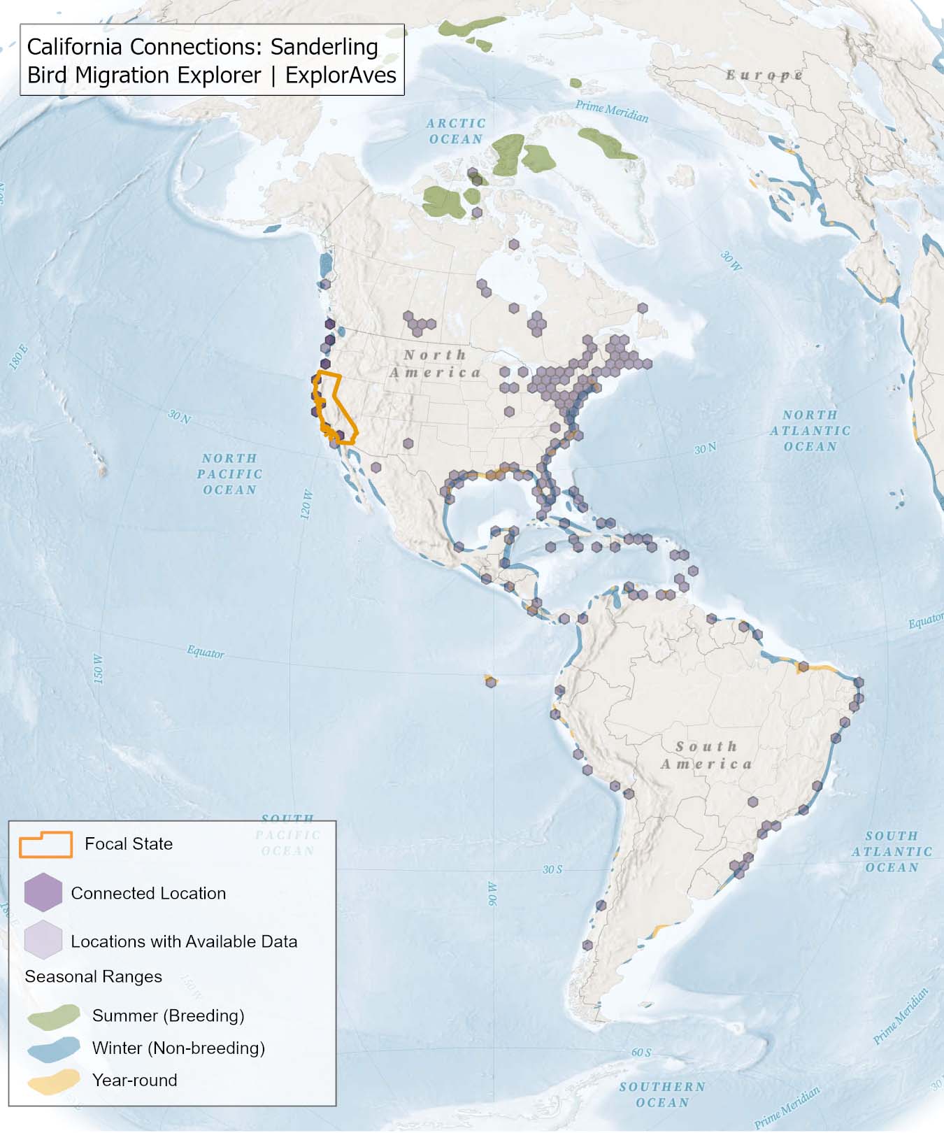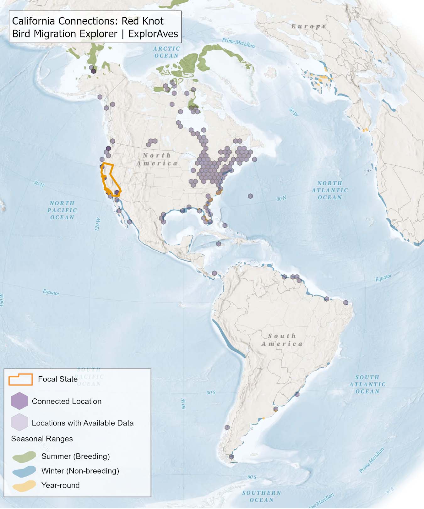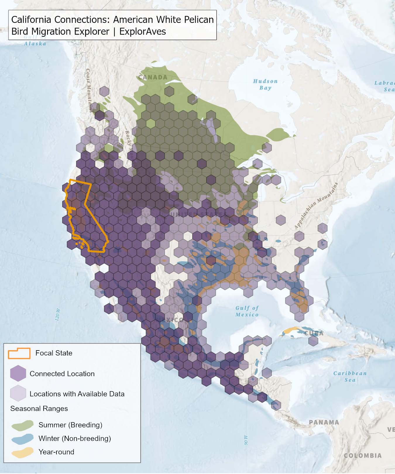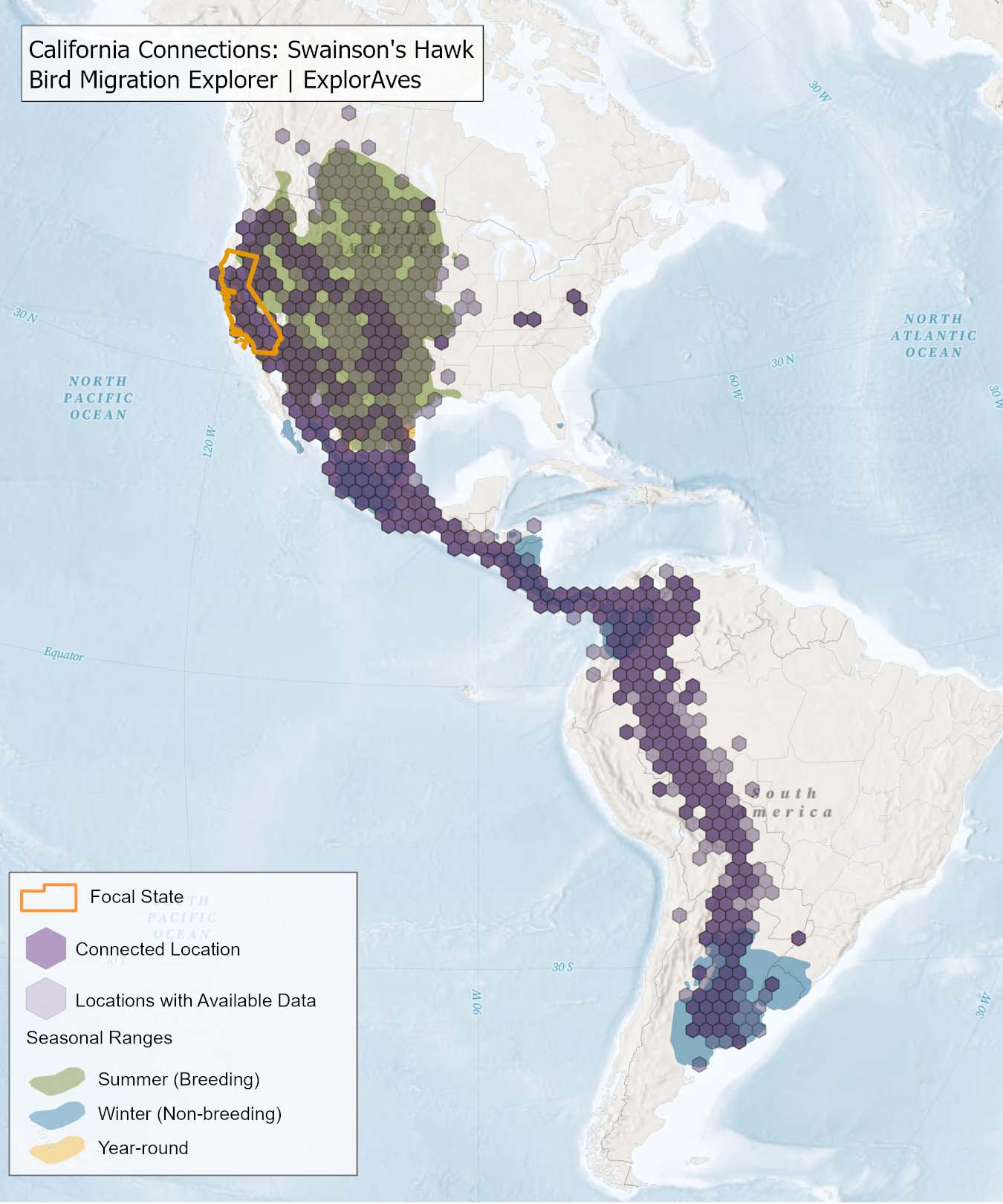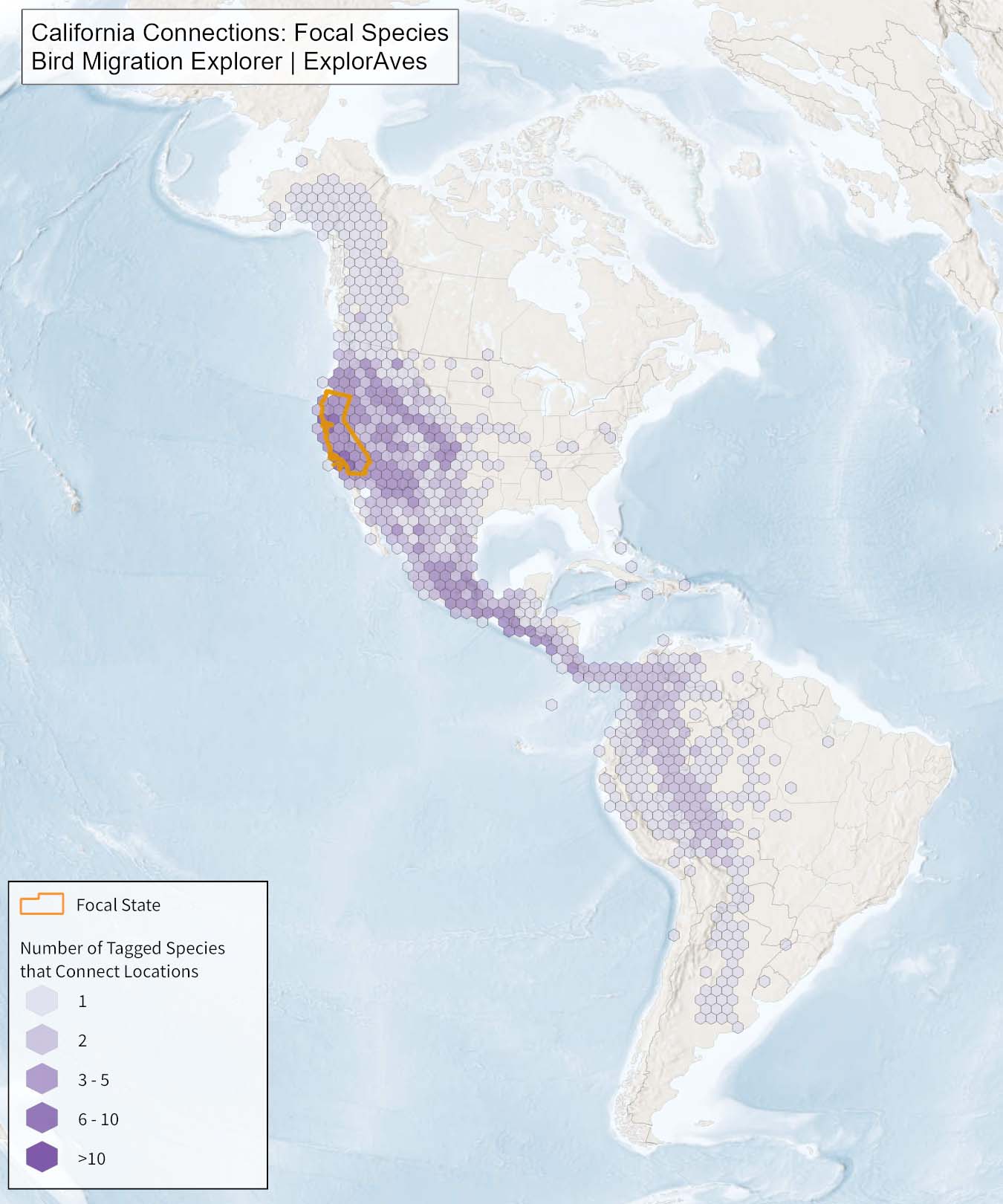 The species connection maps show direct connections between California and locations across the Western Hemisphere based on tagging data in the Bird Migration Explorer available for each of the state’s migratory species of concern. Connections are based on bird band encounter records, automated radio telemetry, archival geolocators, satellite and GPS tracking, or genetic markers that document the movement of individual birds. The maps display locations (i.e., hexagons) that are connected to California (polygon outlined orange) and illustrate the need to protect, restore, enhance and manage safe habitat in those areas to ensure species can satisfy their biological requirements across the full annual cycle. As individual birds travel between the species’ summer (breeding) and winter (stationary non-breeding) ranges, they traverse geopolitical boundaries, underscoring the need for collaborative and coordinated conservation efforts to maximize the return on conservation investments for the species in California. While these maps offer valuable insight, they do not capture the complete picture of all connections, because they only present tagging data available in the Bird Migration Explorer. In some cases, species may not have a connection map, because no tagging data are available.