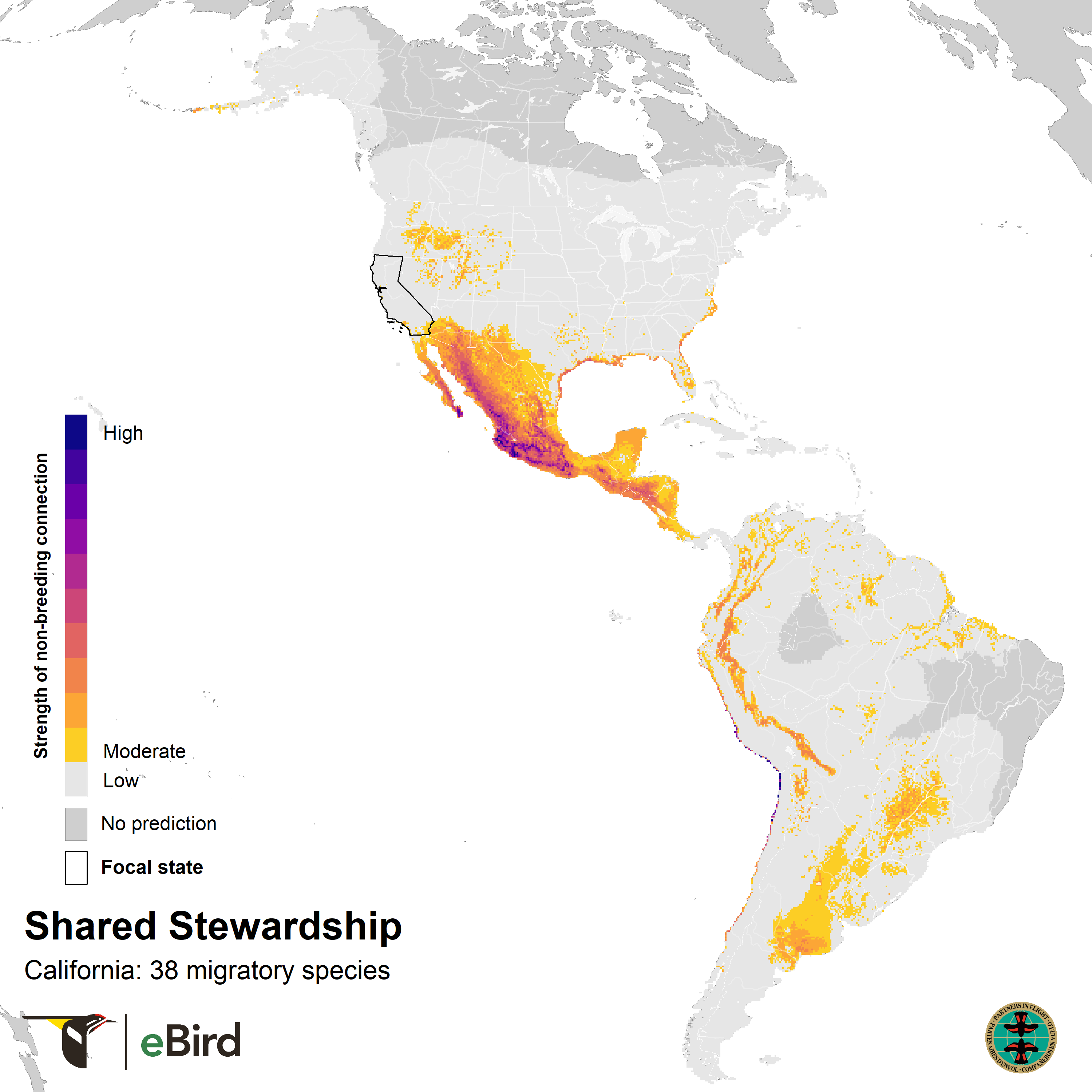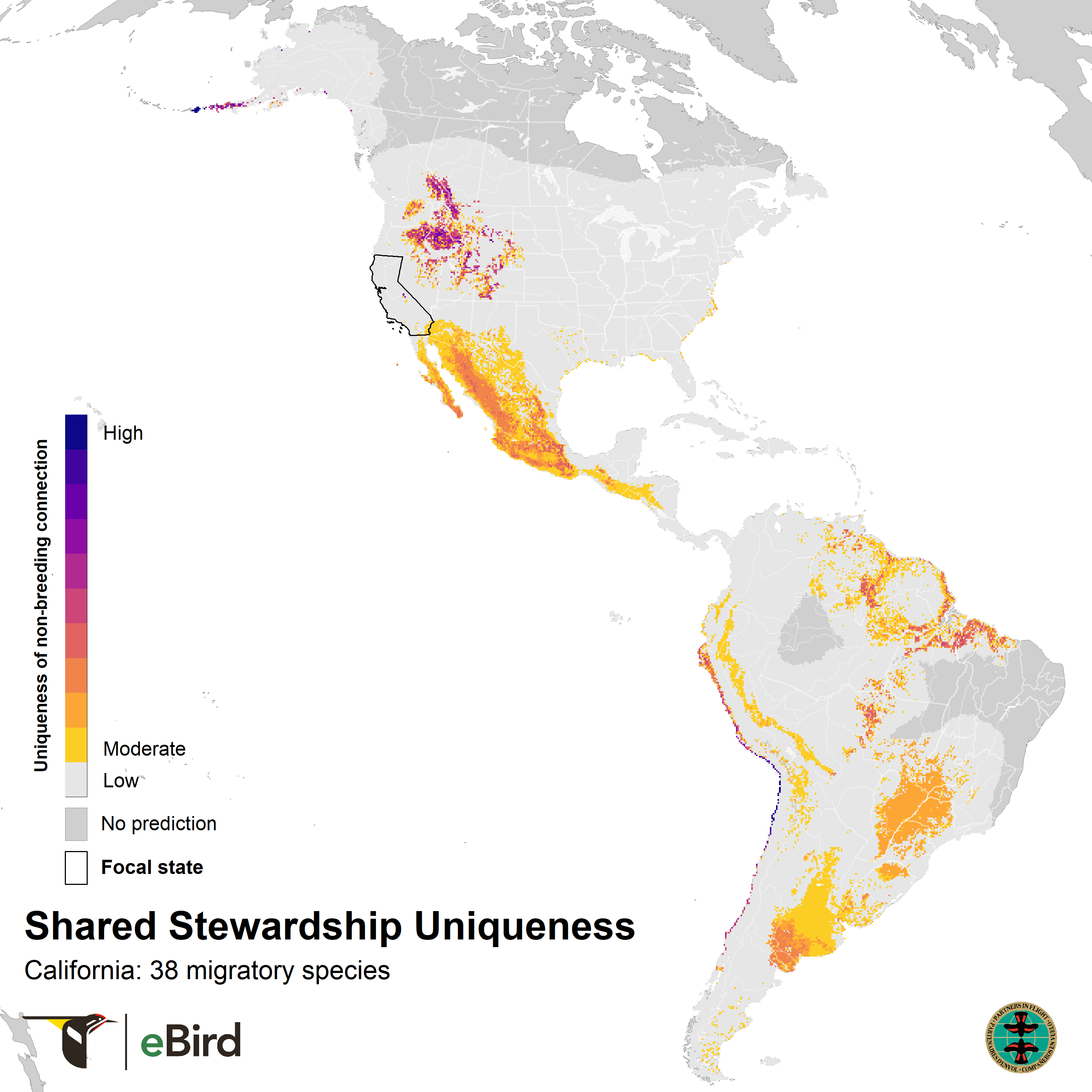 These maps show where 38 migratory species that breed in California are concentrated during the nonbreeding season using year-round distribution models from eBird Status and Trends. They highlight opportunities for conservation across the full annual cycle of birds by informing locations for joint stewardship actions. Shared stewardship, on the left, represents the strength of connection between California and the nonbreeding distributions of California's migratory birds. Shared stewardship uniqueness, on the right, shows this information relative to all 50 states, emphasizing the hotspots where California has unique connections compared to other states. The values in each 3 x 3 km pixel combine information on the number of species, the nonbreeding abundances of those species, and the percent of each species’ breeding population in California.