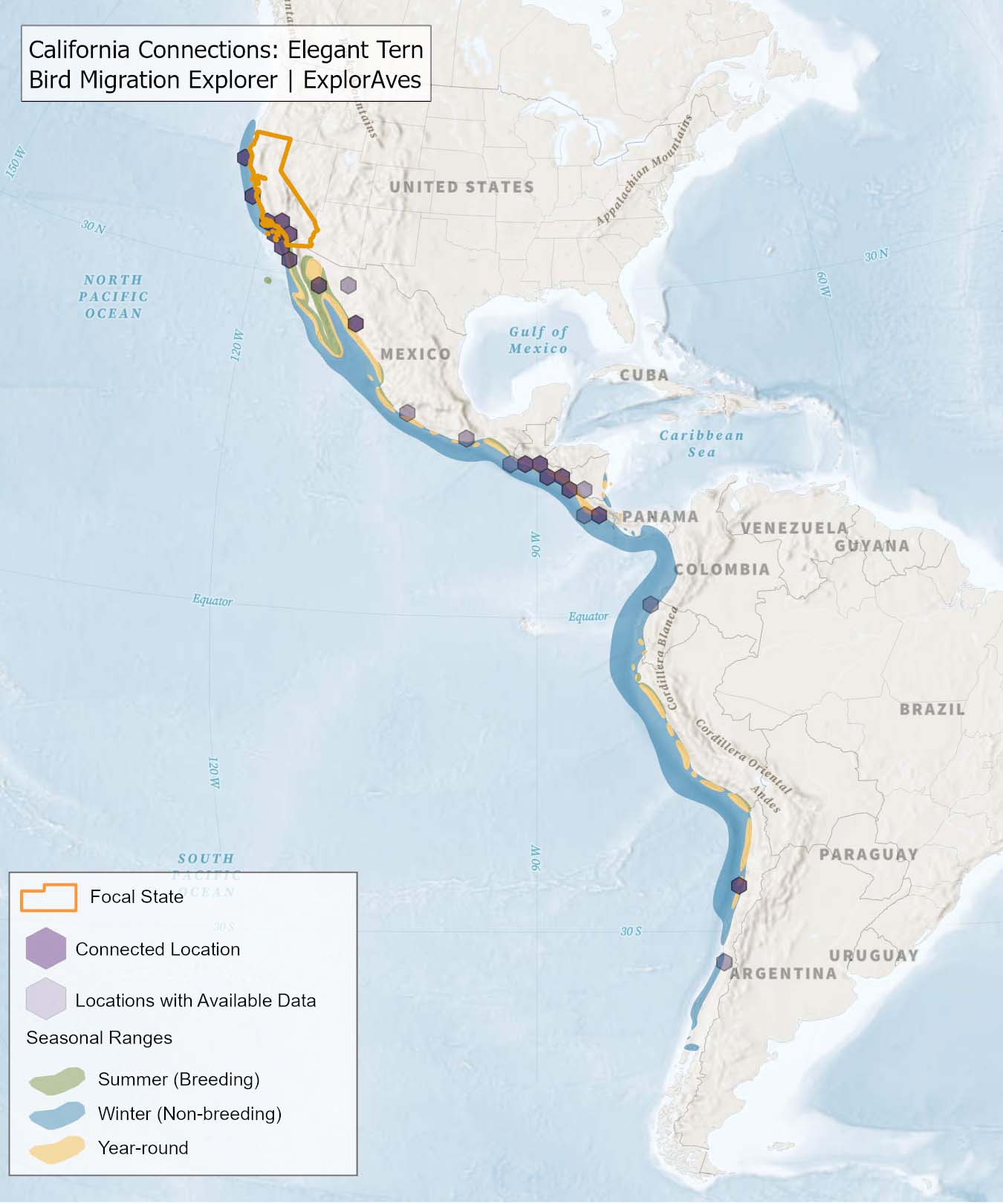 This map shows direct connections between California and locations across the hemisphere based on available tagging data for individual Elegant Tern shared by researchers for the Bird Migration Explorer. Data were generously shared by researchers for the Bird Migration Explorer. The map displays the hexagons that are connected to the state (dark purple) as well as hexagons with available tagging data for the species (light purple) with no direct connections to the state. Explore more connections for Elegant Tern on the Bird Migration Explorer. Download map.