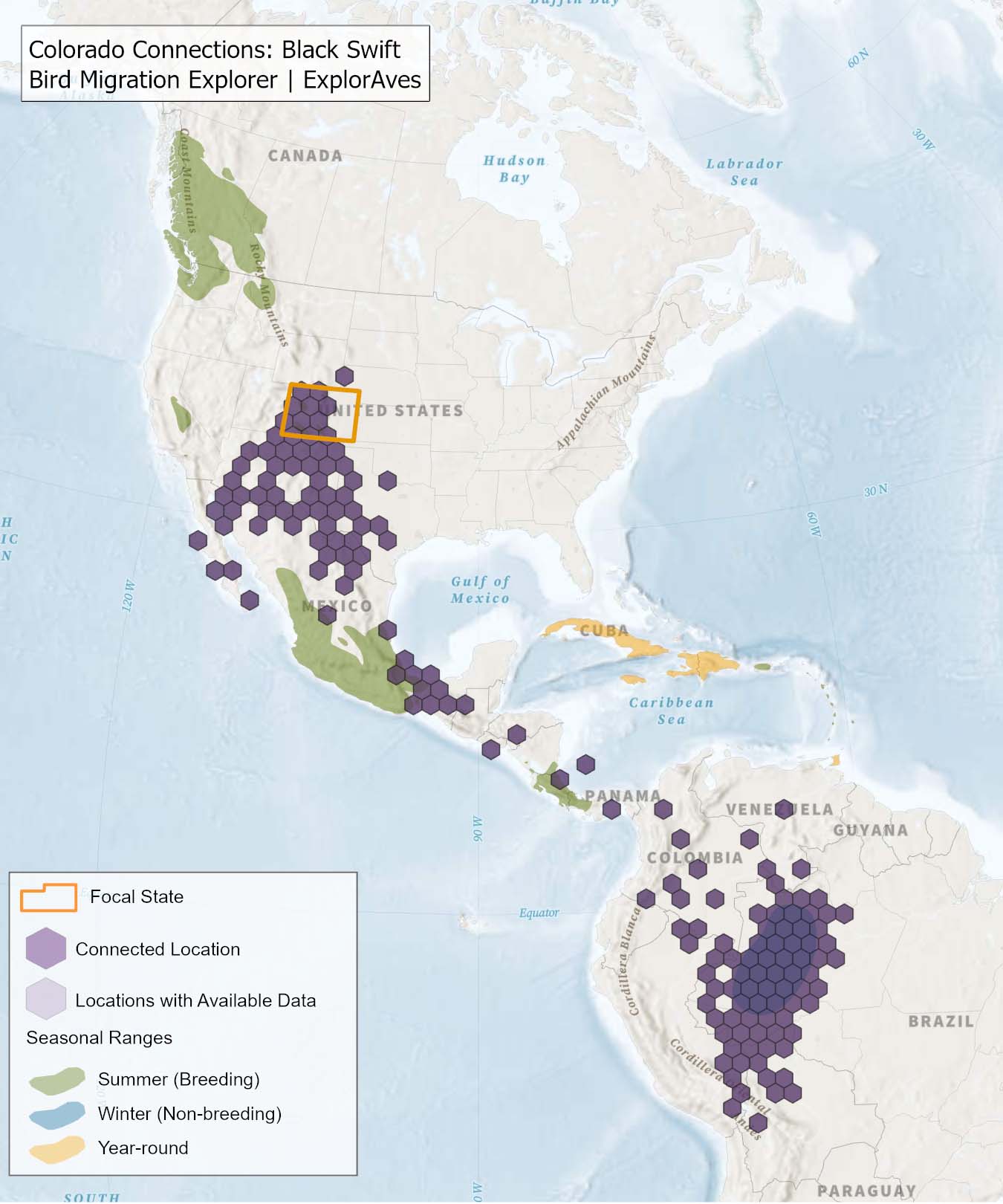 This map shows direct connections between Colorado and locations across the hemisphere based on available tagging data for individual Black Swift shared by researchers for the Bird Migration Explorer. Data were generously shared by researchers for the Bird Migration Explorer. The map displays the hexagons that are connected to the state (dark purple) as well as hexagons with available tagging data for the species (light purple) with no direct connections to the state. Explore more connections for Black Swift on the Bird Migration Explorer. Download map.