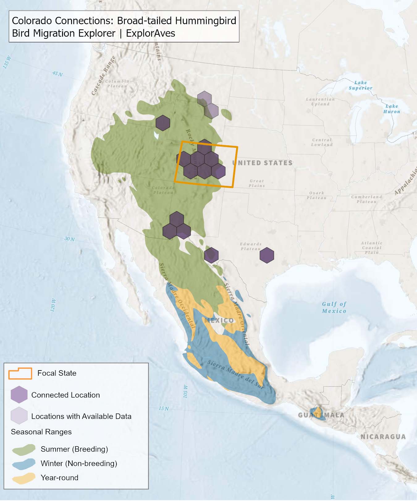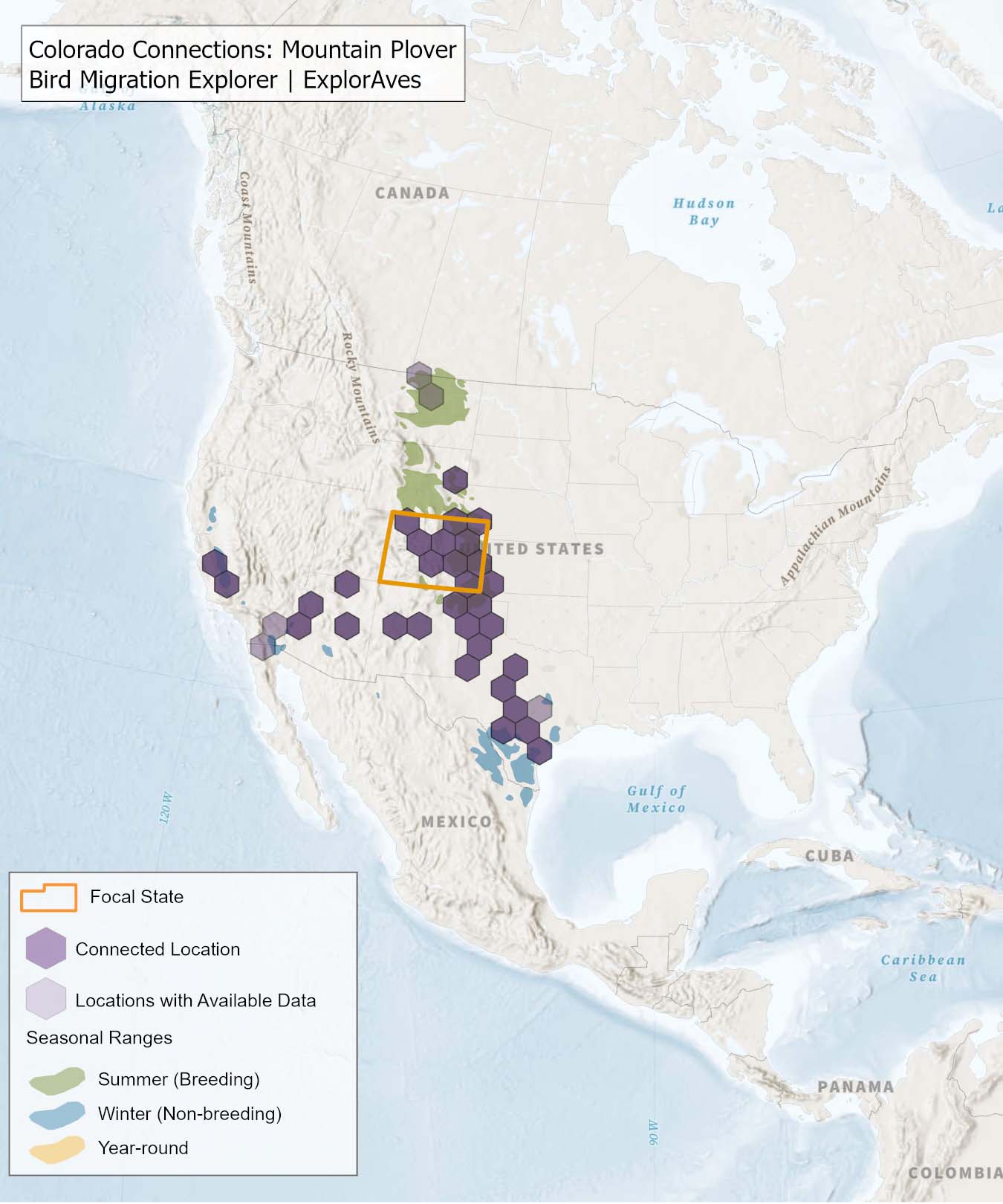 The species connection maps show direct connections between Colorado and locations across the Western Hemisphere based on tagging data in the Bird Migration Explorer available for each of the state’s migratory species of concern. Connections are based on bird band encounter records, automated radio telemetry, archival geolocators, satellite and GPS tracking, or genetic markers that document the movement of individual birds. The maps display locations (i.e., hexagons) that are connected to Colorado (polygon outlined orange) and illustrate the need to protect, restore, enhance and manage safe habitat in those areas to ensure species can satisfy their biological requirements across the full annual cycle. As individual birds travel between the species’ summer (breeding) and winter (stationary non-breeding) ranges, they traverse geopolitical boundaries, underscoring the need for collaborative and coordinated conservation efforts to maximize the return on conservation investments for the species in Colorado. While these maps offer valuable insight, they do not capture the complete picture of all connections, because they only present tagging data available in the Bird Migration Explorer. In some cases, species may not have a connection map, because no tagging data are available.