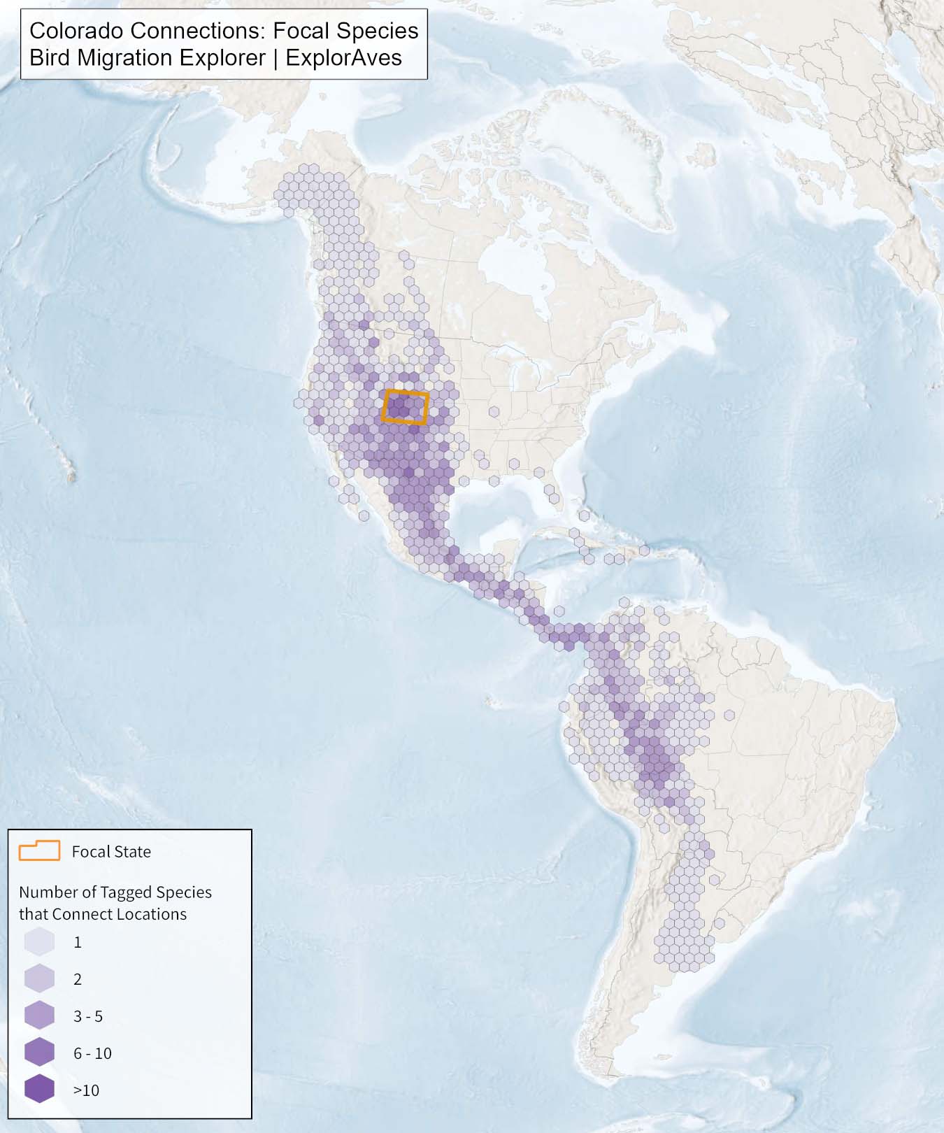 This map shows direct connections between Colorado and other locations across the Western Hemisphere based on tagging data available in the Bird Migration Explorer for the state’s migratory focal species. Connections are based on bird band encounter records, automated radio telemetry, archival geolocators, satellite and GPS tracking, or genetic markers that document the movement of individual birds. The map displays the number of migratory focal species that connect each location (hexagon) to Colorado. While these data offer valuable insight, they do not capture the complete picture of all connections because they only present available tagging data for the subset of species of concern identified by each state. The multi-species tagging connections map illustrates the need to protect, restore, enhance and manage safe habitat in locations connected to the state to ensure migratory species can access the resources they need across the full annual cycle. As individual birds travel between species’ summer (breeding) and winter (stationary non-breeding) ranges, they traverse geopolitical boundaries, underscoring the need for coordinated conservation efforts to maximize the return on conservation investments in Colorado. Additionally, multi-species connection maps illustrate Colorado's crucial role in safeguarding the migratory movements of these species.