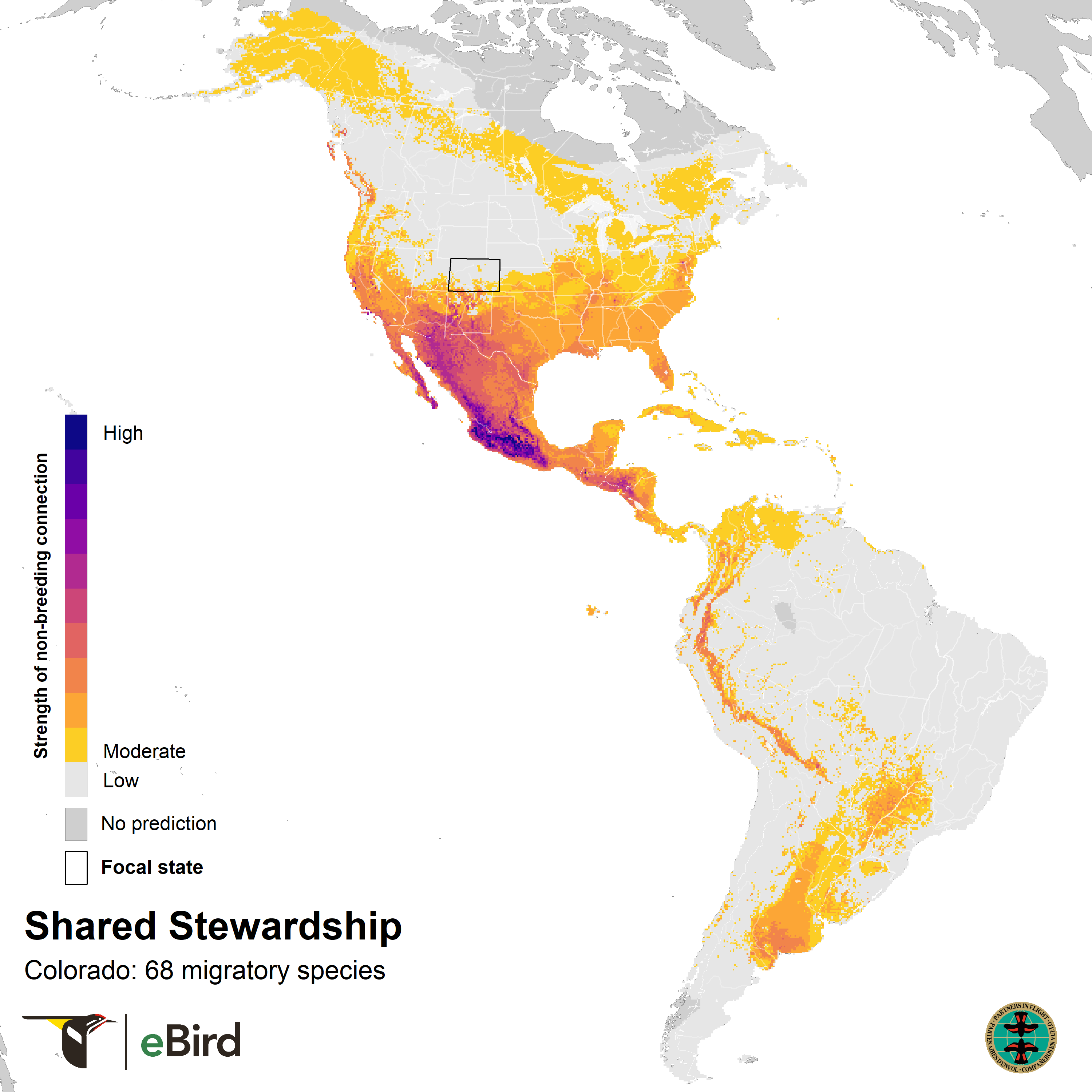 These maps show where 68 migratory species that breed in Colorado are concentrated during the nonbreeding season using year-round distribution models from eBird Status and Trends. They highlight opportunities for conservation across the full annual cycle of birds by informing locations for joint stewardship actions. Shared stewardship, on the left, represents the strength of connection between Colorado and the nonbreeding distributions of Colorado's migratory birds. Shared stewardship uniqueness, on the right, shows this information relative to all 50 states, emphasizing the hotspots where Colorado has unique connections compared to other states. The values in each 3 x 3 km pixel combine information on the number of species, the nonbreeding abundances of those species, and the percent of each species’ breeding population in Colorado.