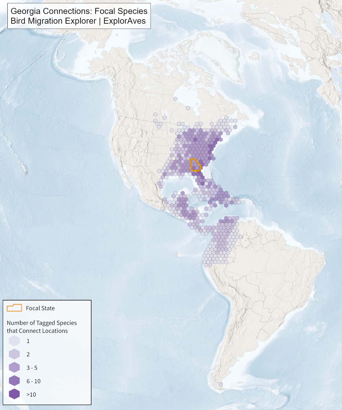 This map shows direct connections between Georgia and other locations across the Western Hemisphere based on tagging data available in the Bird Migration Explorer for the state’s migratory focal species. Connections are based on bird band encounter records, automated radio telemetry, archival geolocators, satellite and GPS tracking, or genetic markers that document the movement of individual birds. The map displays the number of migratory focal species that connect each location (hexagon) to Georgia. While these data offer valuable insight, they do not capture the complete picture of all connections because they only present available tagging data for the subset of species of concern identified by each state. The multi-species tagging connections map illustrates the need to protect, restore, enhance and manage safe habitat in locations connected to the state to ensure migratory species can access the resources they need across the full annual cycle. As individual birds travel between species’ summer (breeding) and winter (stationary non-breeding) ranges, they traverse geopolitical boundaries, underscoring the need for coordinated conservation efforts to maximize the return on conservation investments in Georgia. Additionally, multi-species connection maps illustrate Georgia's crucial role in safeguarding the migratory movements of these species.