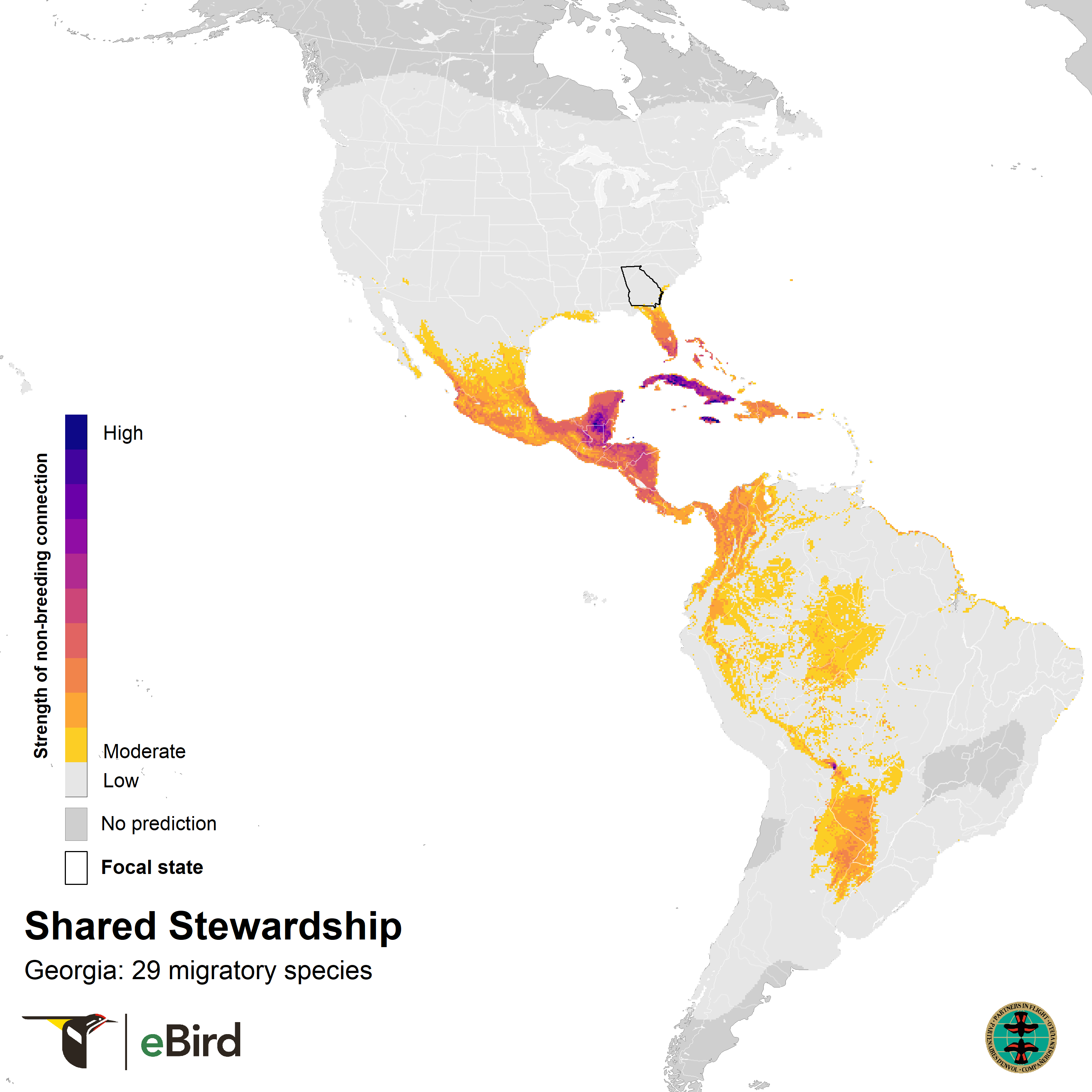 (1) A state-level overview of where the migratory birds that breed in Georgia are found during the non-breeding season based on Shared Stewardship Connection Maps.