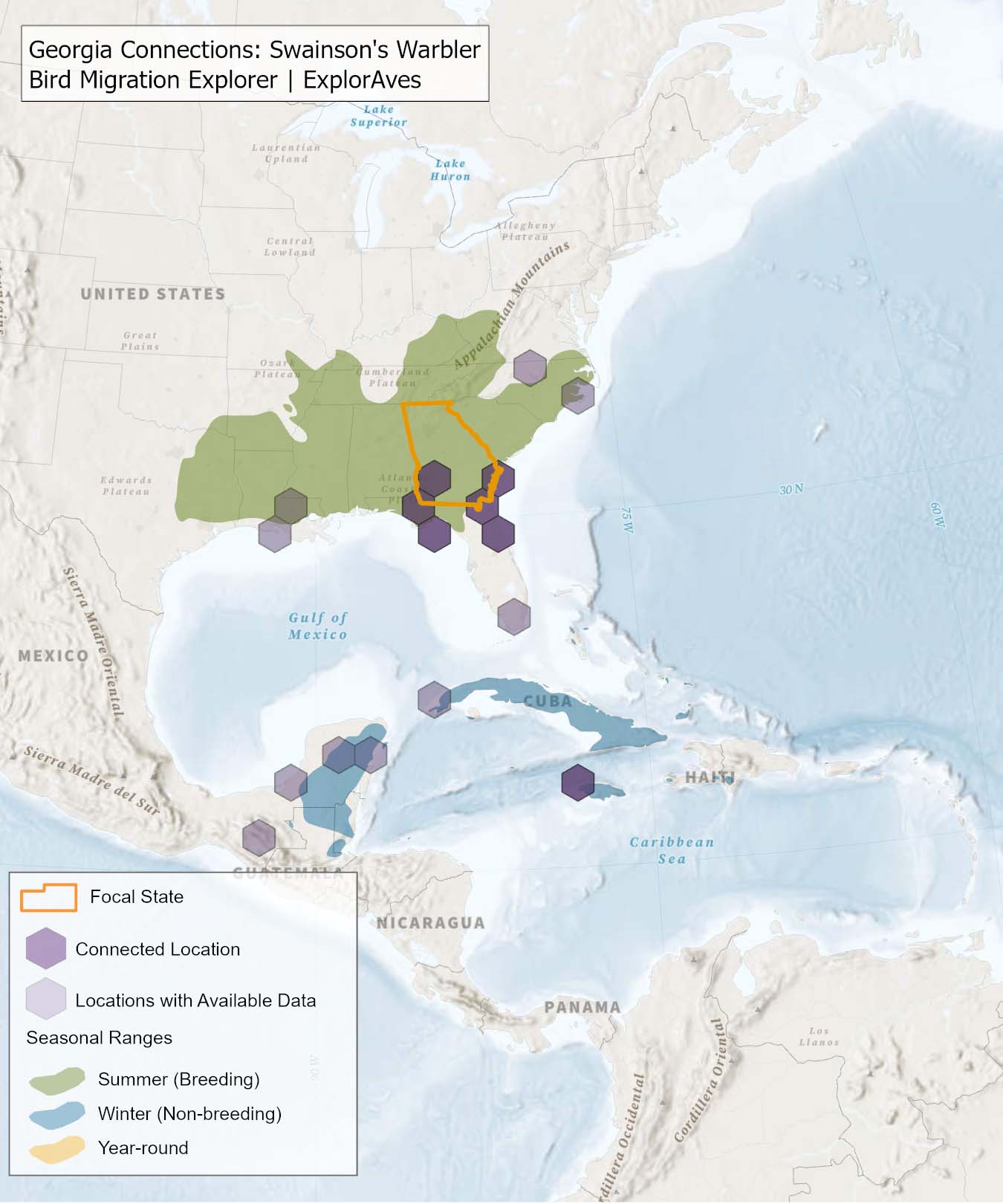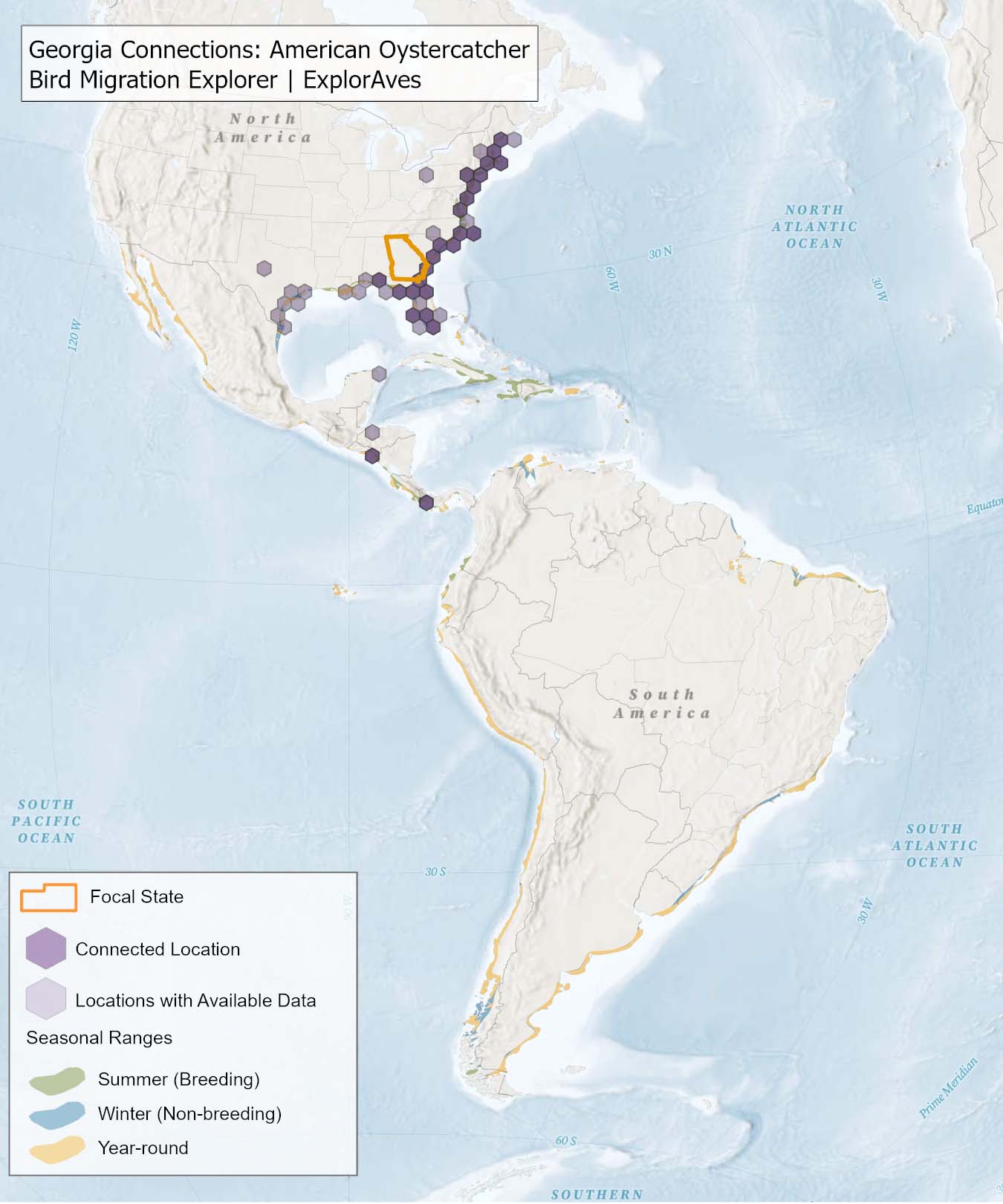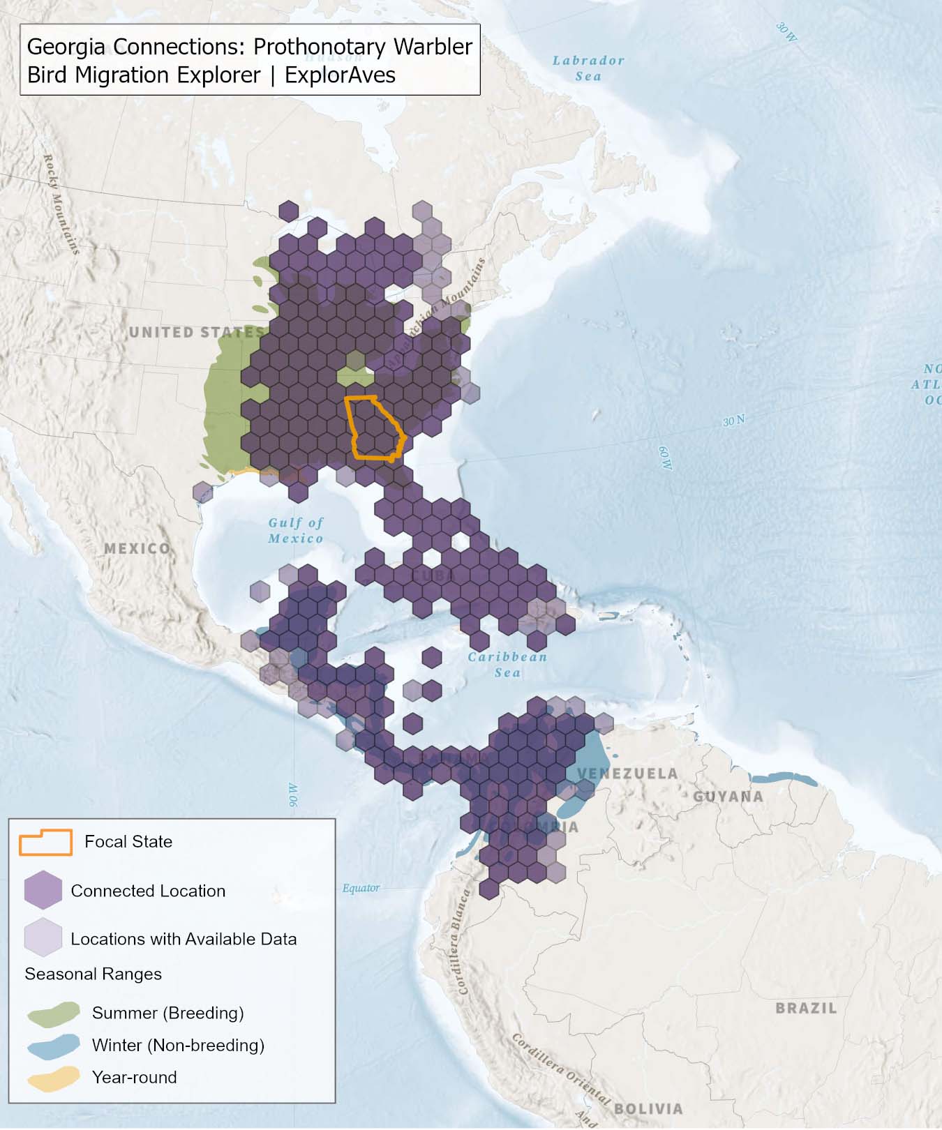 The species connection maps show direct connections between Georgia and locations across the Western Hemisphere based on tagging data in the Bird Migration Explorer available for each of the state’s migratory species of concern. Connections are based on bird band encounter records, automated radio telemetry, archival geolocators, satellite and GPS tracking, or genetic markers that document the movement of individual birds. The maps display locations (i.e., hexagons) that are connected to Georgia (polygon outlined orange) and illustrate the need to protect, restore, enhance and manage safe habitat in those areas to ensure species can satisfy their biological requirements across the full annual cycle. As individual birds travel between the species’ summer (breeding) and winter (stationary non-breeding) ranges, they traverse geopolitical boundaries, underscoring the need for collaborative and coordinated conservation efforts to maximize the return on conservation investments for the species in Georgia. While these maps offer valuable insight, they do not capture the complete picture of all connections, because they only present tagging data available in the Bird Migration Explorer. In some cases, species may not have a connection map, because no tagging data are available.