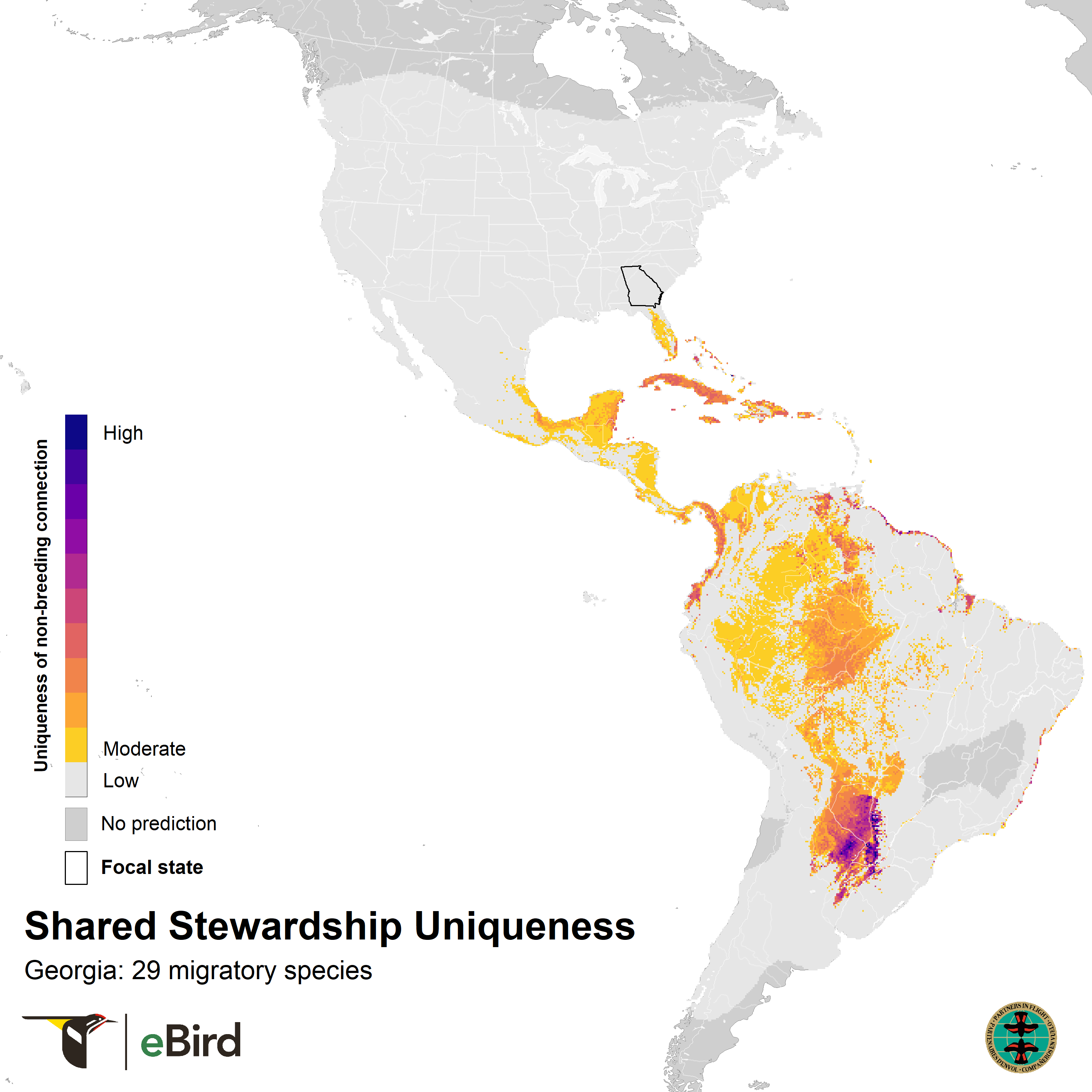 These maps show where 29 migratory species that breed in Georgia are concentrated during the nonbreeding season using year-round distribution models from eBird Status and Trends. They highlight opportunities for conservation across the full annual cycle of birds by informing locations for joint stewardship actions. Shared stewardship, on the left, represents the strength of connection between Georgia and the nonbreeding distributions of Georgia's migratory birds. Shared stewardship uniqueness, on the right, shows this information relative to all 50 states, emphasizing the hotspots where Georgia has unique connections compared to other states. The values in each 3 x 3 km pixel combine information on the number of species, the nonbreeding abundances of those species, and the percent of each species’ breeding population in Georgia.