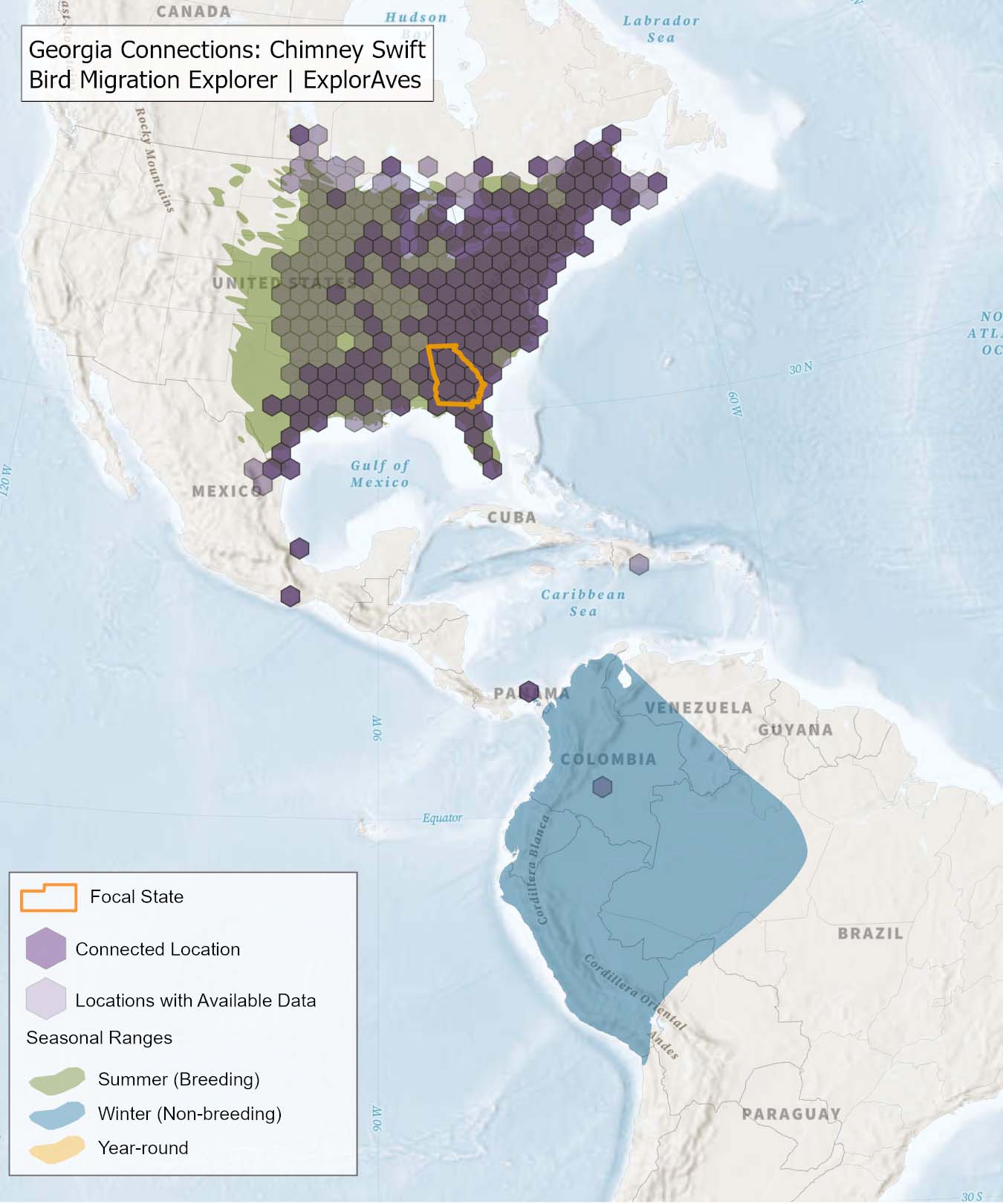 This map shows direct connections between Georgia and locations across the hemisphere based on available tagging data for individual Chimney Swift shared by researchers for the Bird Migration Explorer. Data were generously shared by researchers for the Bird Migration Explorer. The map displays the hexagons that are connected to the state (dark purple) as well as hexagons with available tagging data for the species (light purple) with no direct connections to the state. Explore more connections for Chimney Swift on the Bird Migration Explorer. Download map.