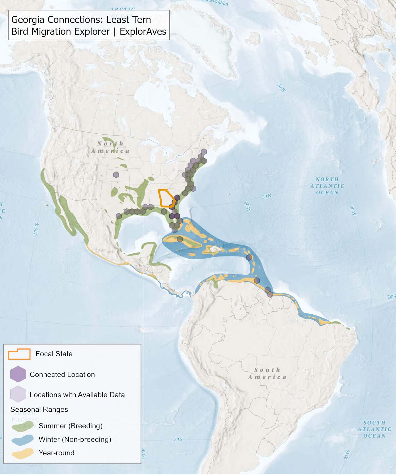 This map shows direct connections between Georgia and locations across the hemisphere based on available tagging data for individual Least Tern shared by researchers for the Bird Migration Explorer. Data were generously shared by researchers for the Bird Migration Explorer. The map displays the hexagons that are connected to the state (dark purple) as well as hexagons with available tagging data for the species (light purple) with no direct connections to the state. Explore more connections for Least Tern on the Bird Migration Explorer. Download map.