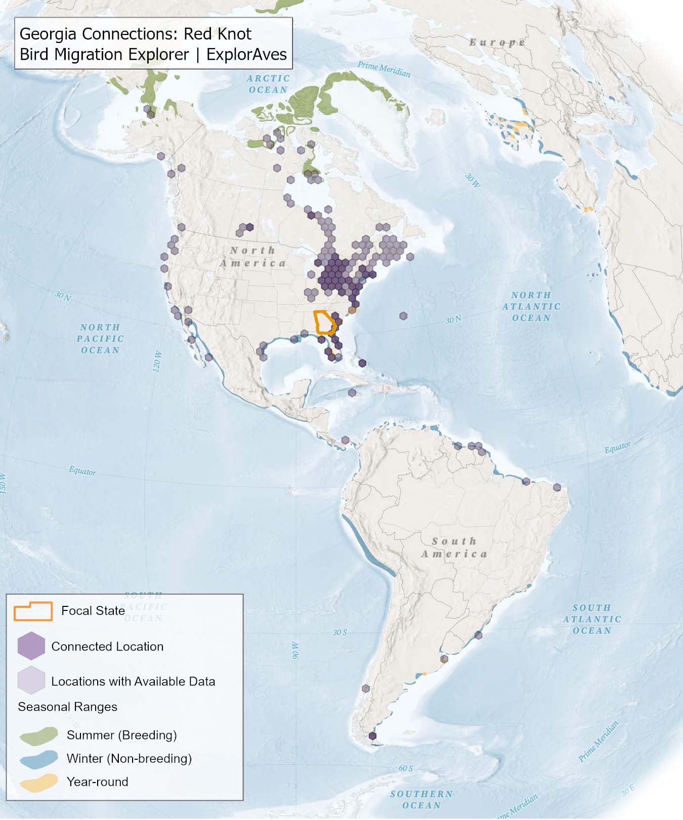 This map shows direct connections between Georgia and locations across the hemisphere based on available tagging data for individual Red Knot shared by researchers for the Bird Migration Explorer. Data were generously shared by researchers for the Bird Migration Explorer. The map displays the hexagons that are connected to the state (dark purple) as well as hexagons with available tagging data for the species (light purple) with no direct connections to the state. Explore more connections for Red Knot on the Bird Migration Explorer. Download map.