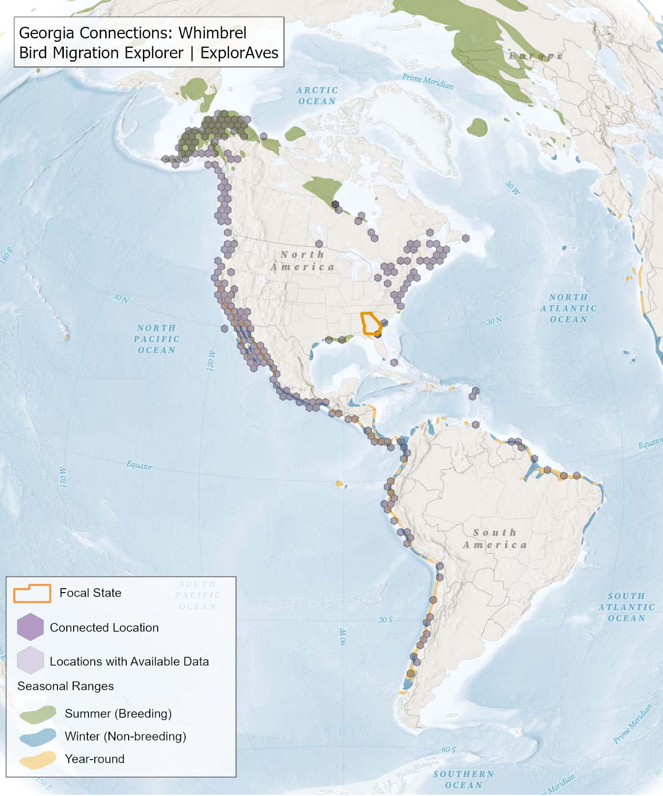 This map shows direct connections between Georgia and locations across the hemisphere based on available tagging data for individual Whimbrel shared by researchers for the Bird Migration Explorer. Data were generously shared by researchers for the Bird Migration Explorer. The map displays the hexagons that are connected to the state (dark purple) as well as hexagons with available tagging data for the species (light purple) with no direct connections to the state. Explore more connections for Whimbrel on the Bird Migration Explorer. Download map.