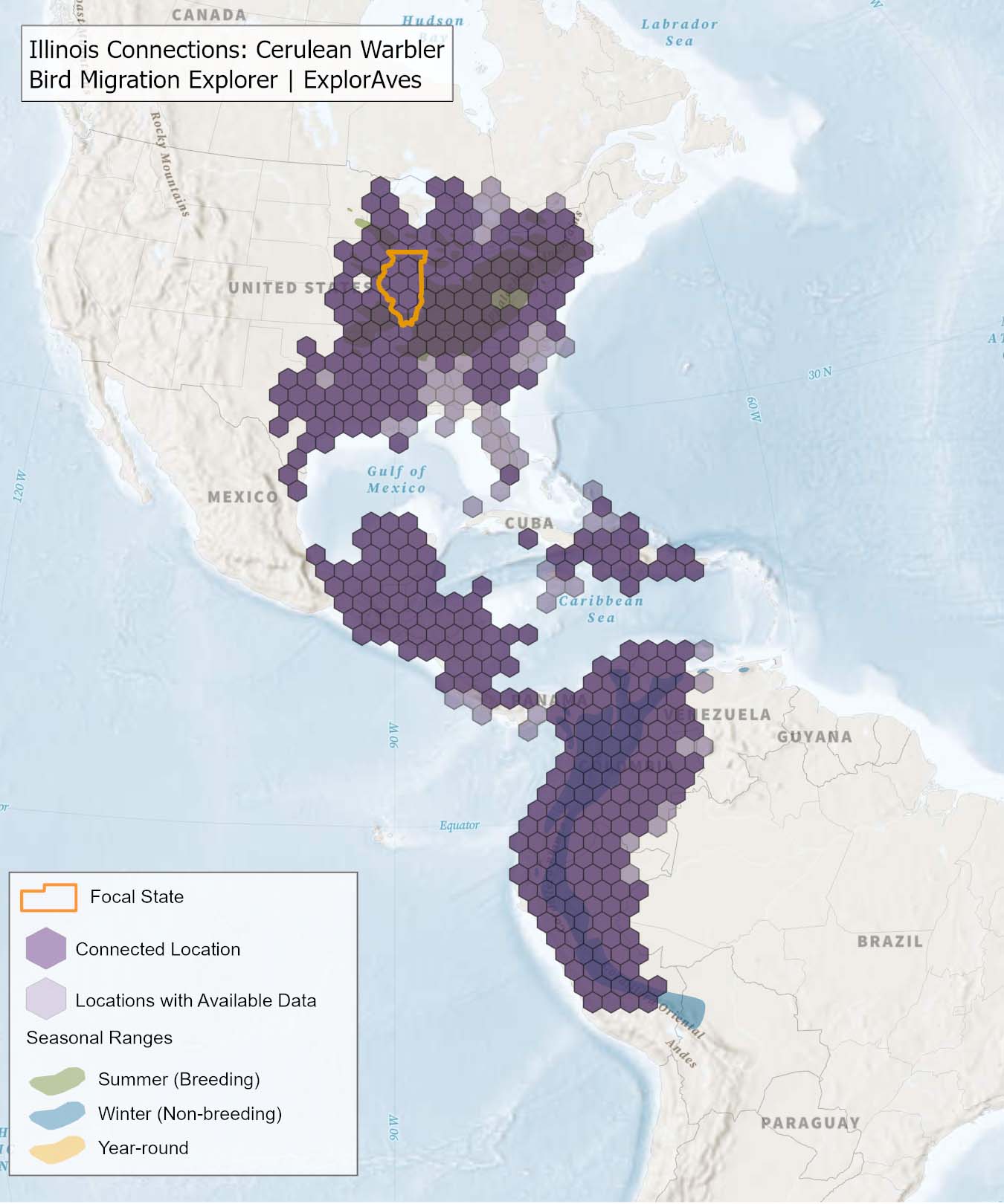 This map map shows direct connections between Illinois and locations across the hemisphere based on available tagging data for individual Cerulean Warbler shared by researchers for the Bird Migration Explorer. Data were generously shared by researchers for the Bird Migration Explorer. The map displays the hexagons that are connected to the state (dark purple) as well as hexagons with available tagging data for the species (light purple) with no direct connections to the state. Explore more connections for Cerulean Warbler on the Bird Migration Explorer. Download map.