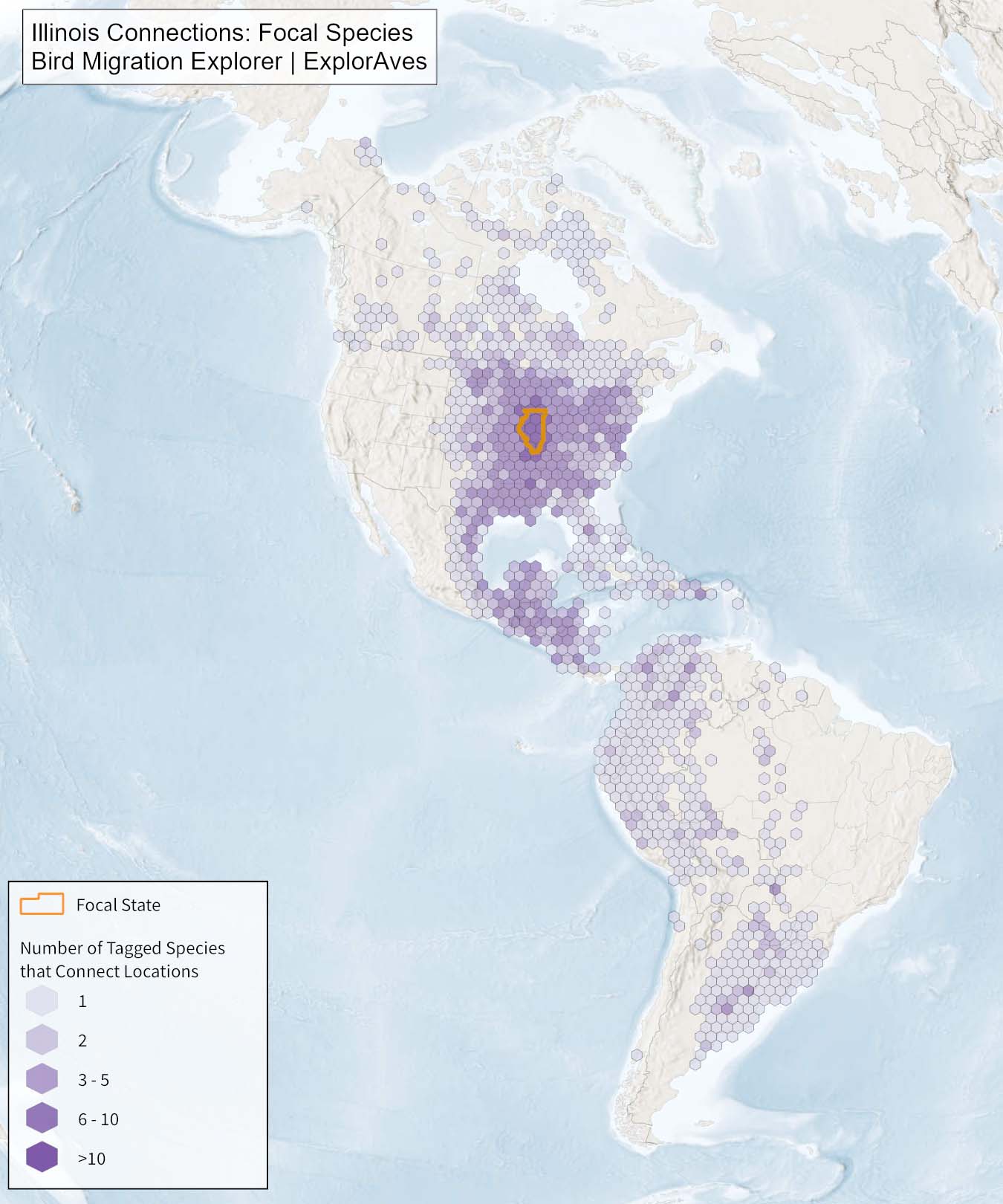 This map shows direct connections between Illinois and other locations across the Western Hemisphere based on tagging data available in the Bird Migration Explorer for the state’s migratory focal species. Connections are based on bird band encounter records, automated radio telemetry, archival geolocators, satellite and GPS tracking, or genetic markers that document the movement of individual birds. The map displays the number of migratory focal species that connect each location (hexagon) to Illinois. While these data offer valuable insight, they do not capture the complete picture of all connections because they only present available tagging data for the subset of species of concern identified by each state. The multi-species tagging connections map illustrates the need to protect, restore, enhance and manage safe habitat in locations connected to the state to ensure migratory species can access the resources they need across the full annual cycle. As individual birds travel between species’ summer (breeding) and winter (stationary non-breeding) ranges, they traverse geopolitical boundaries, underscoring the need for coordinated conservation efforts to maximize the return on conservation investments in Illinois. Additionally, multi-species connection maps illustrate Illinois' crucial role in safeguarding the migratory movements of these species.