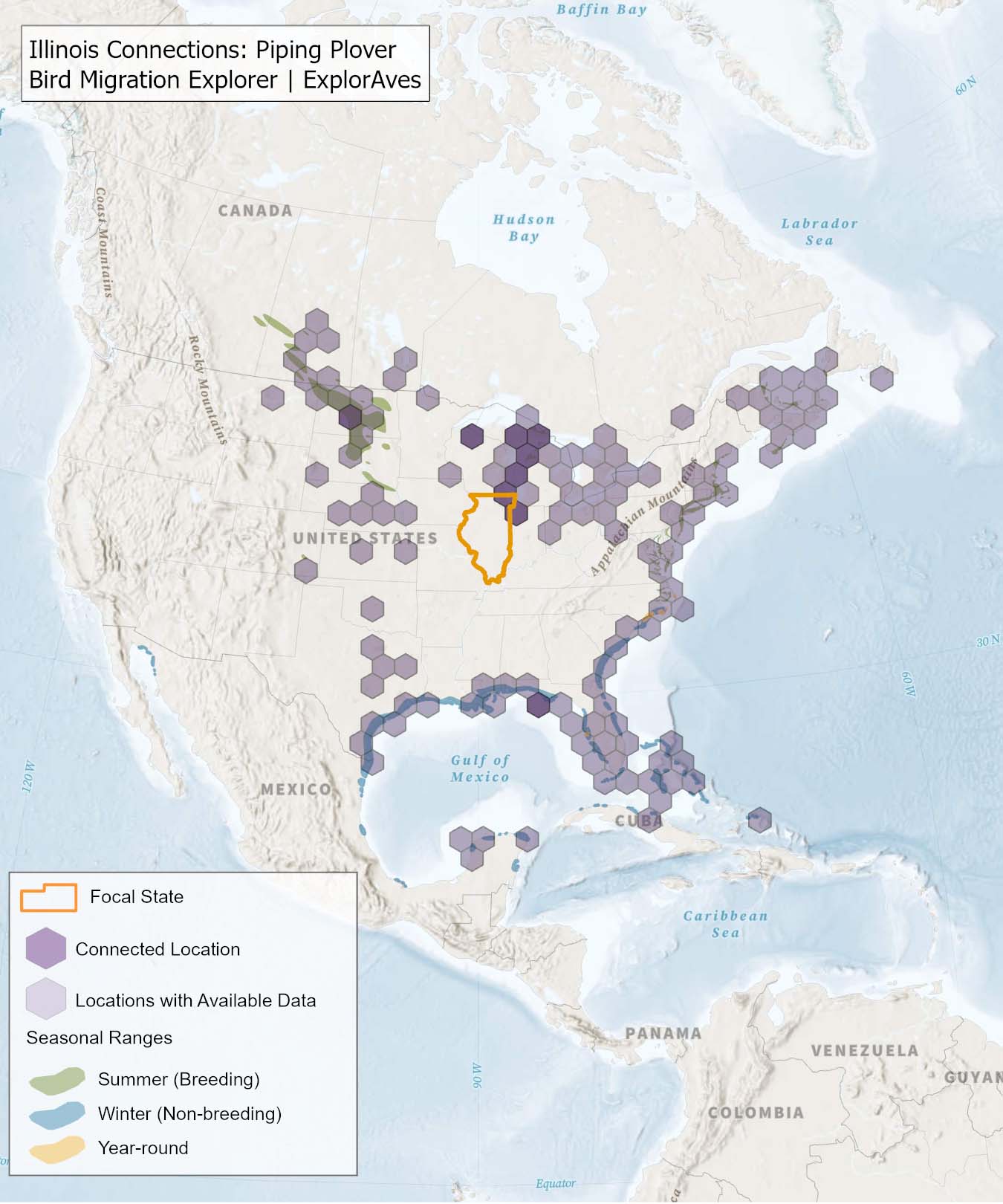 This map shows direct connections between Illinois and locations across the hemisphere based on available tagging data for individual Piping Plover shared by researchers for the Bird Migration Explorer. Data were generously shared by researchers for the Bird Migration Explorer. The map displays the hexagons that are connected to the state (dark purple) as well as hexagons with available tagging data for the species (light purple) with no direct connections to the state. Explore more connections for Piping Plover on the Bird Migration Explorer. Download map.