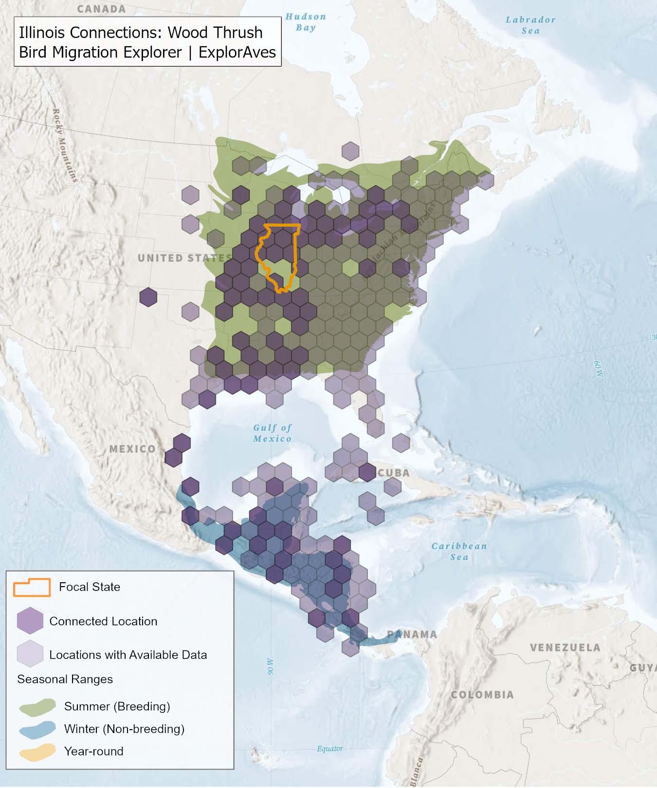 The species connection maps show direct connections between Illinois and locations across the Western Hemisphere based on tracking data in the Bird Migration Explorer available for each of the state’s migratory species of concern. Connections are based on bird band encounter records, automated radio telemetry, archival geolocators, satellite and GPS tracking, or genetic markers that document the movement of individual birds. The maps display locations (i.e., hexagons) that are connected to Illinois (polygon outlined orange) and illustrate the need to protect, restore, enhance and manage safe habitat in those areas to ensure species can satisfy their biological requirements across the full annual cycle. As individual birds travel between the species’ summer (breeding) and winter (stationary non-breeding) ranges, they traverse geopolitical boundaries, underscoring the need for collaborative and coordinated conservation efforts to maximize the return on conservation investments for the species in Illinois. While these maps offer valuable insight, they do not capture the complete picture of all connections, because they only present tracking data available in the Bird Migration Explorer. In some cases, species may not have a connection map, because no tracking data are available.