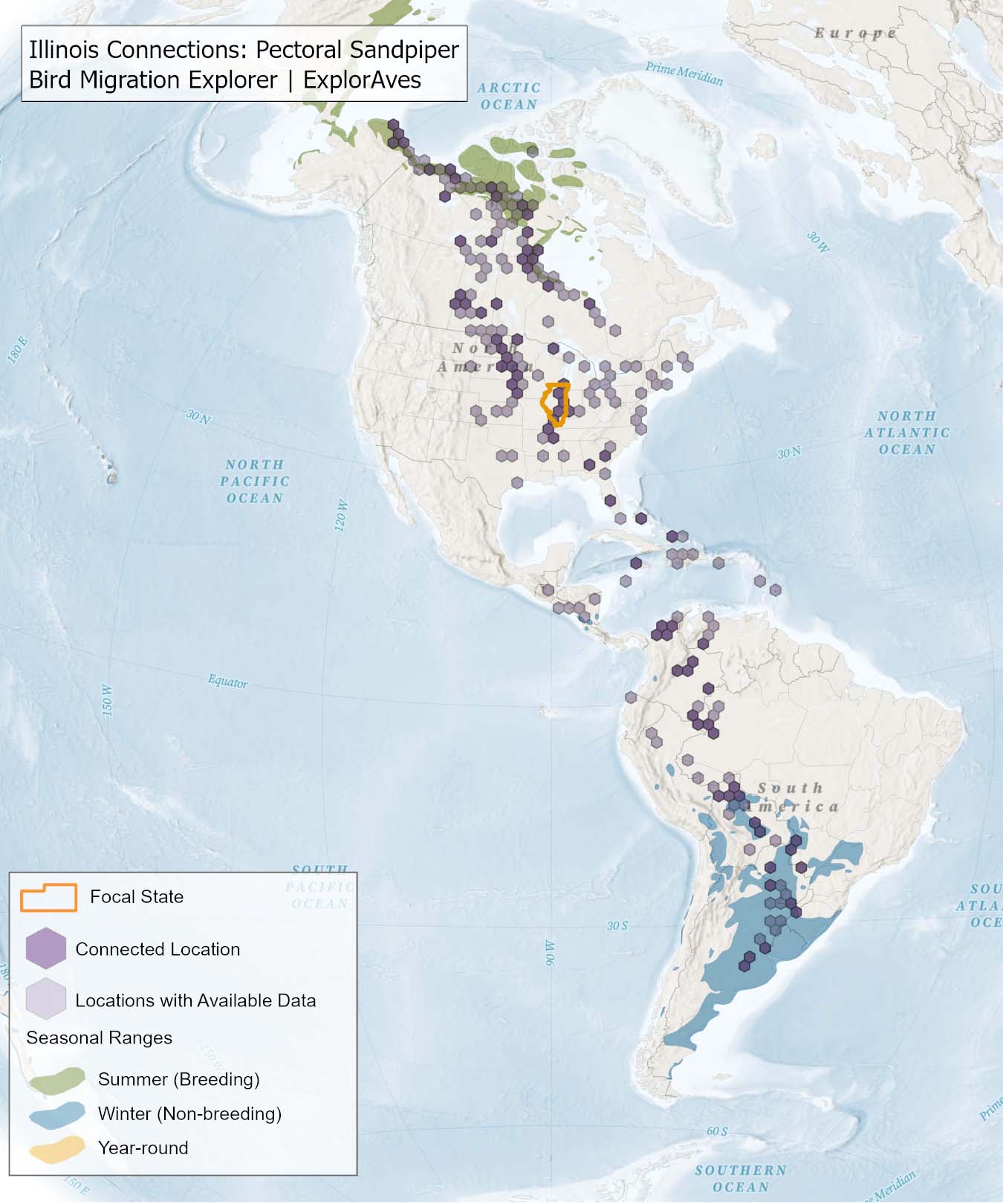This map shows direct connections between Illinois and locations across the hemisphere based on available tagging data for individual Pectoral Sandpiper shared by researchers for the Bird Migration Explorer. Data were generously shared by researchers for the Bird Migration Explorer. The map displays the hexagons that are connected to the state (dark purple) as well as hexagons with available tagging data for the species (light purple) with no direct connections to the state. Explore more connections for Pectoral Sandpiper on the Bird Migration Explorer. Download map.