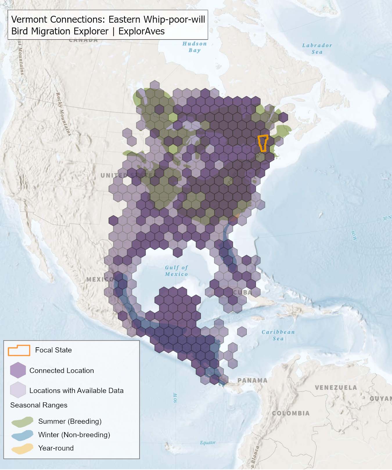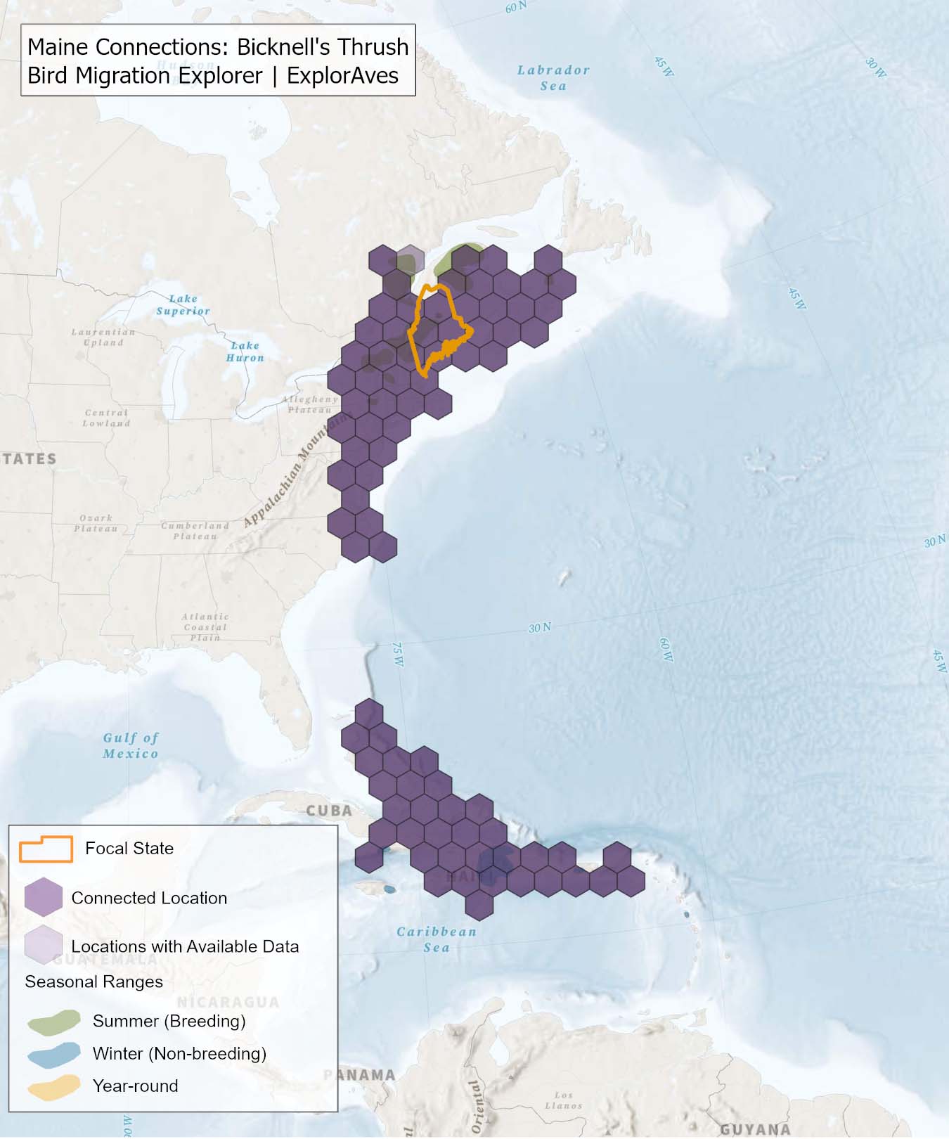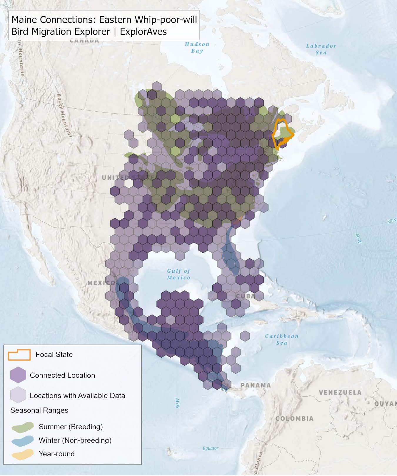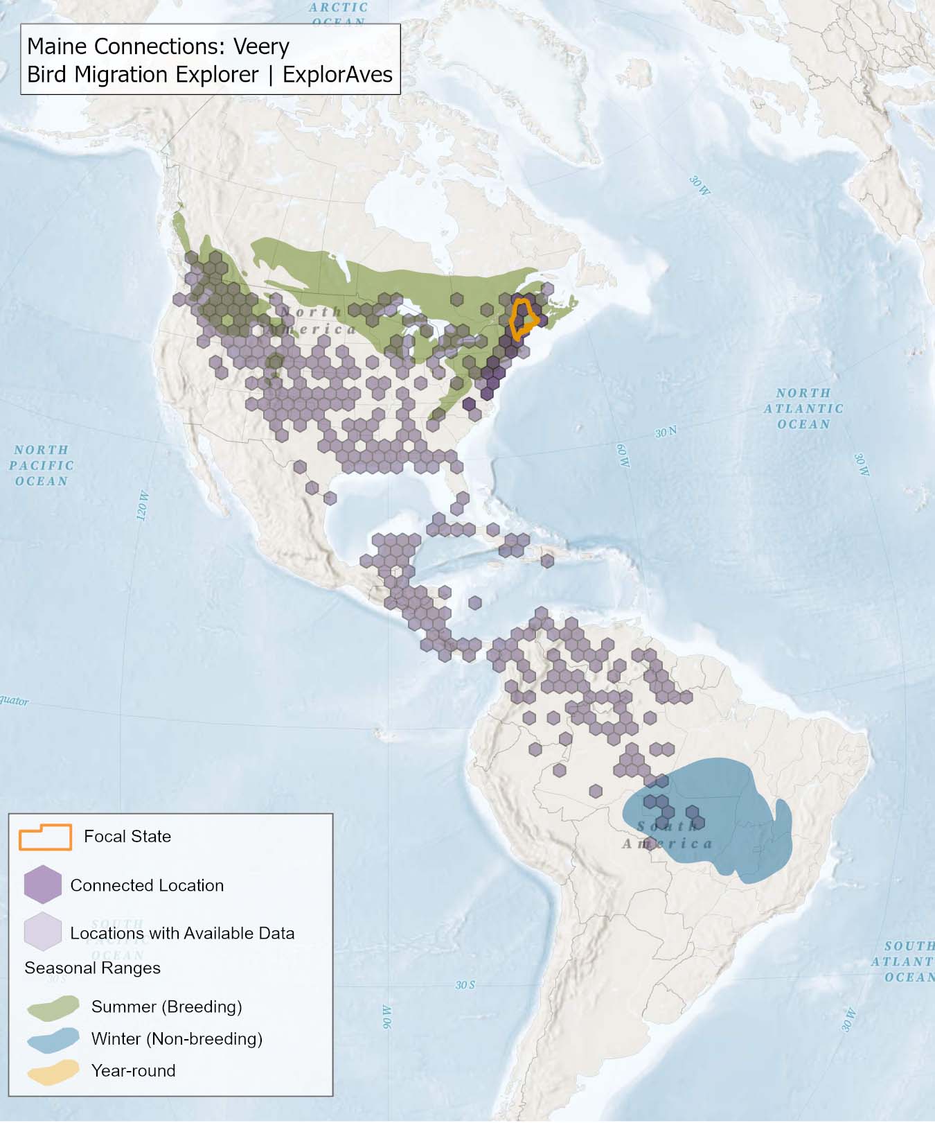 The species connection maps show direct connections between Maine and locations across the Western Hemisphere based on tagging data in the Bird Migration Explorer available for each of the state’s migratory species of concern. Connections are based on bird band encounter records, automated radio telemetry, archival geolocators, satellite and GPS tracking, or genetic markers that document the movement of individual birds. The maps display locations (i.e., hexagons) that are connected to Maine (polygon outlined orange) and illustrate the need to protect, restore, enhance and manage safe habitat in those areas to ensure species can satisfy their biological requirements across the full annual cycle. As individual birds travel between the species’ summer (breeding) and winter (stationary non-breeding) ranges, they traverse geopolitical boundaries, underscoring the need for collaborative and coordinated conservation efforts to maximize the return on conservation investments for the species in Maine. While these maps offer valuable insight, they do not capture the complete picture of all connections, because they only present tagging data available in the Bird Migration Explorer. In some cases, species may not have a connection map, because no tagging data are available.