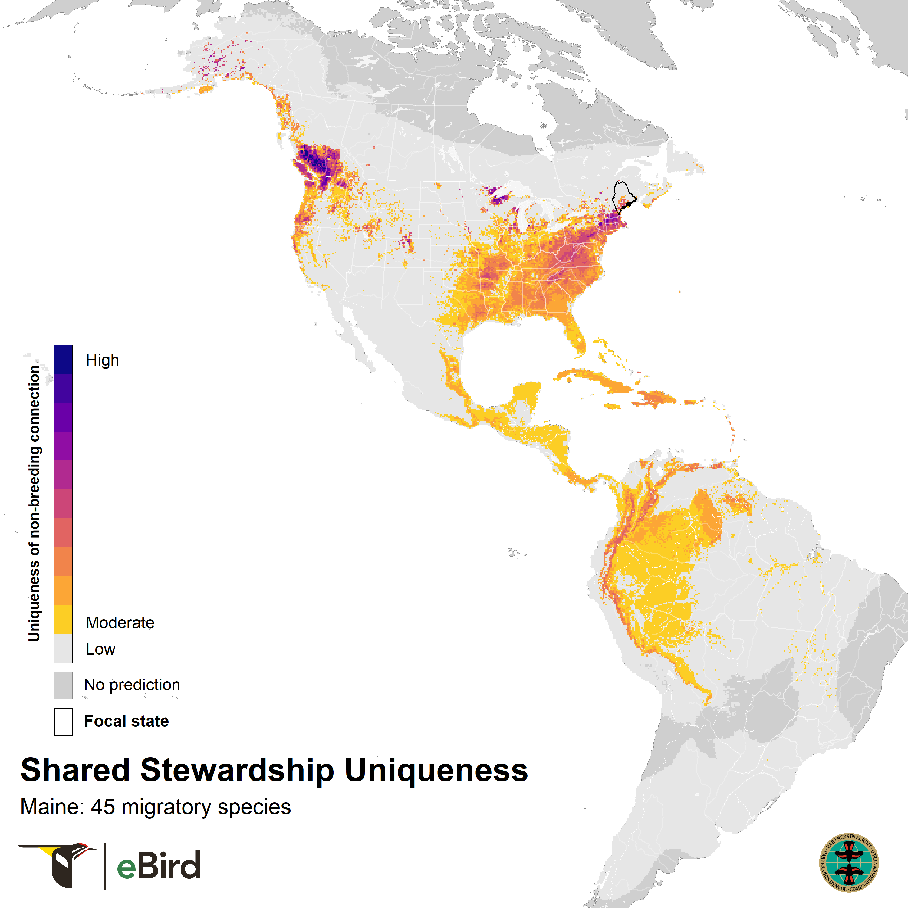 These maps show where 45 migratory species that breed in Maine are concentrated during the nonbreeding season using year-round distribution models from eBird Status and Trends. They highlight opportunities for conservation across the full annual cycle of birds by informing locations for joint stewardship actions. Shared stewardship, on the left, represents the strength of connection between Maine and the nonbreeding distributions of Maine's migratory birds. Shared stewardship uniqueness, on the right, shows this information relative to all 50 states, emphasizing the hotspots where Maine has unique connections compared to other states. The values in each 3 x 3 km pixel combine information on the number of species, the nonbreeding abundances of those species, and the percent of each species’ breeding population in Maine.
