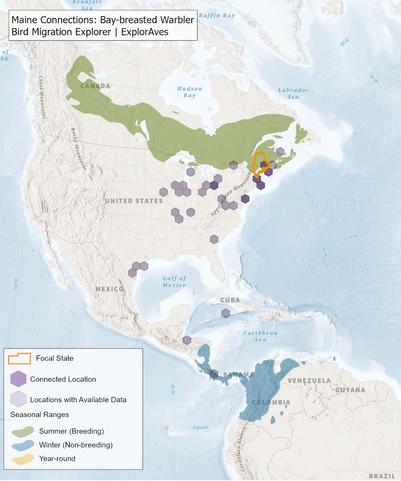 This map shows direct connections between Maine and locations across the hemisphere based on available tagging data for individual Bay-breasted Warbler shared by researchers for the Bird Migration Explorer. Data were generously shared by researchers for the Bird Migration Explorer. The map displays the hexagons that are connected to the state (dark purple) as well as hexagons with available tagging data for the species (light purple) with no direct connections to the state. Explore more connections for Bay-breasted Warbler on the Bird Migration Explorer. Download map.
