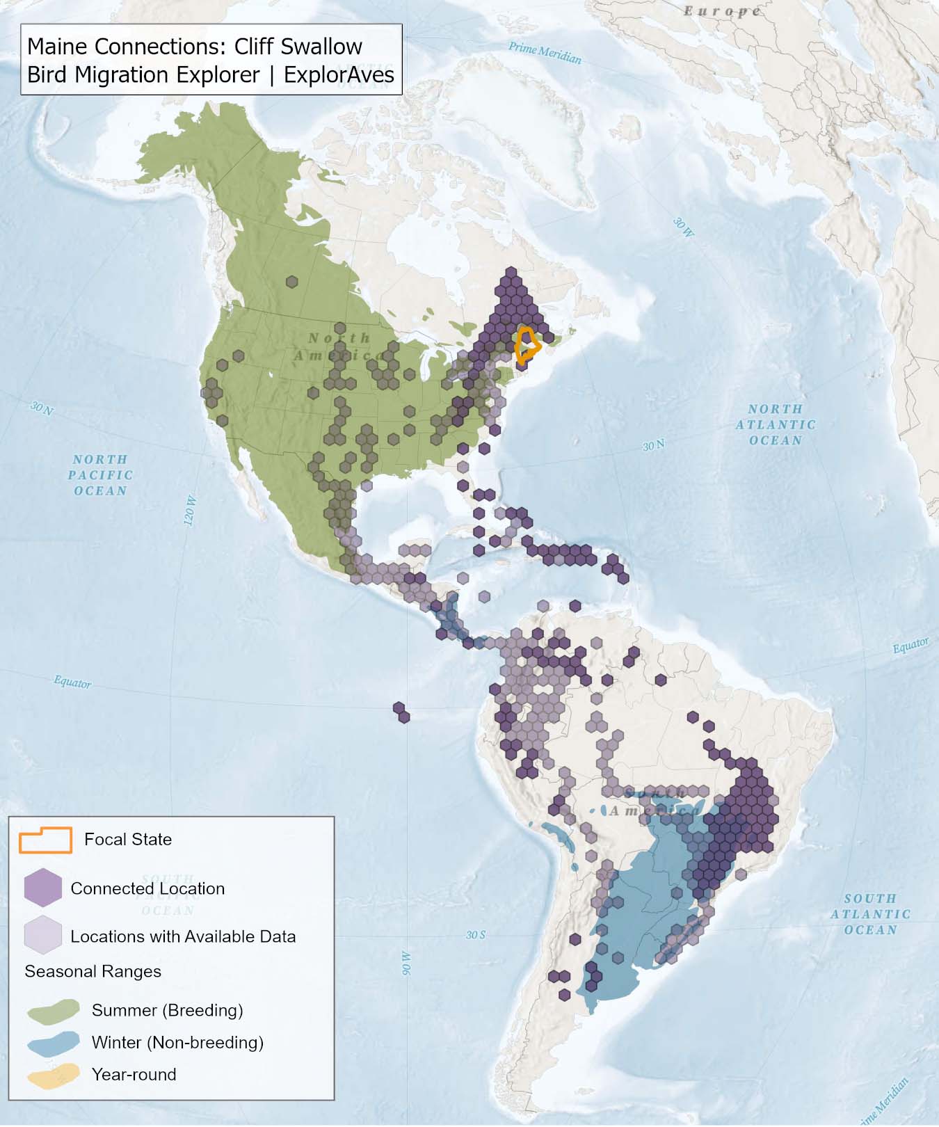 This map map shows direct connections between Maine and locations across the hemisphere based on available tagging data for individual Cliff Swallow shared by researchers for the Bird Migration Explorer. Data were generously shared by researchers for the Bird Migration Explorer. The map displays the hexagons that are connected to the state (dark purple) as well as hexagons with available tagging data for the species (light purple) with no direct connections to the state. Explore more connections for Cliff Swallow on the Bird Migration Explorer. Download map.