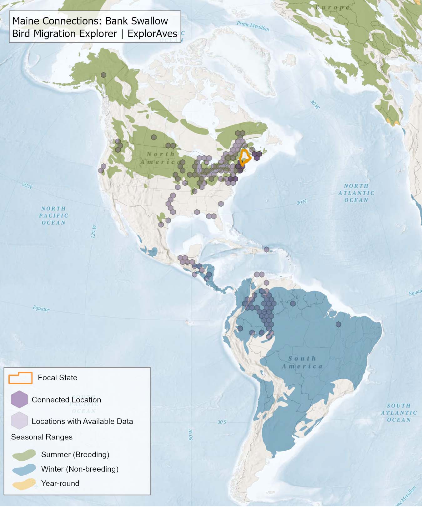 This map shows direct connections between Maine and locations across the hemisphere based on available tagging data for individual Bank Swallow shared by researchers for the Bird Migration Explorer. Data were generously shared by researchers for the Bird Migration Explorer. The map displays the hexagons that are connected to the state (dark purple) as well as hexagons with available tagging data for the species (light purple) with no direct connections to the state. Explore more connections for Bank Swallow on the Bird Migration Explorer. Download map.