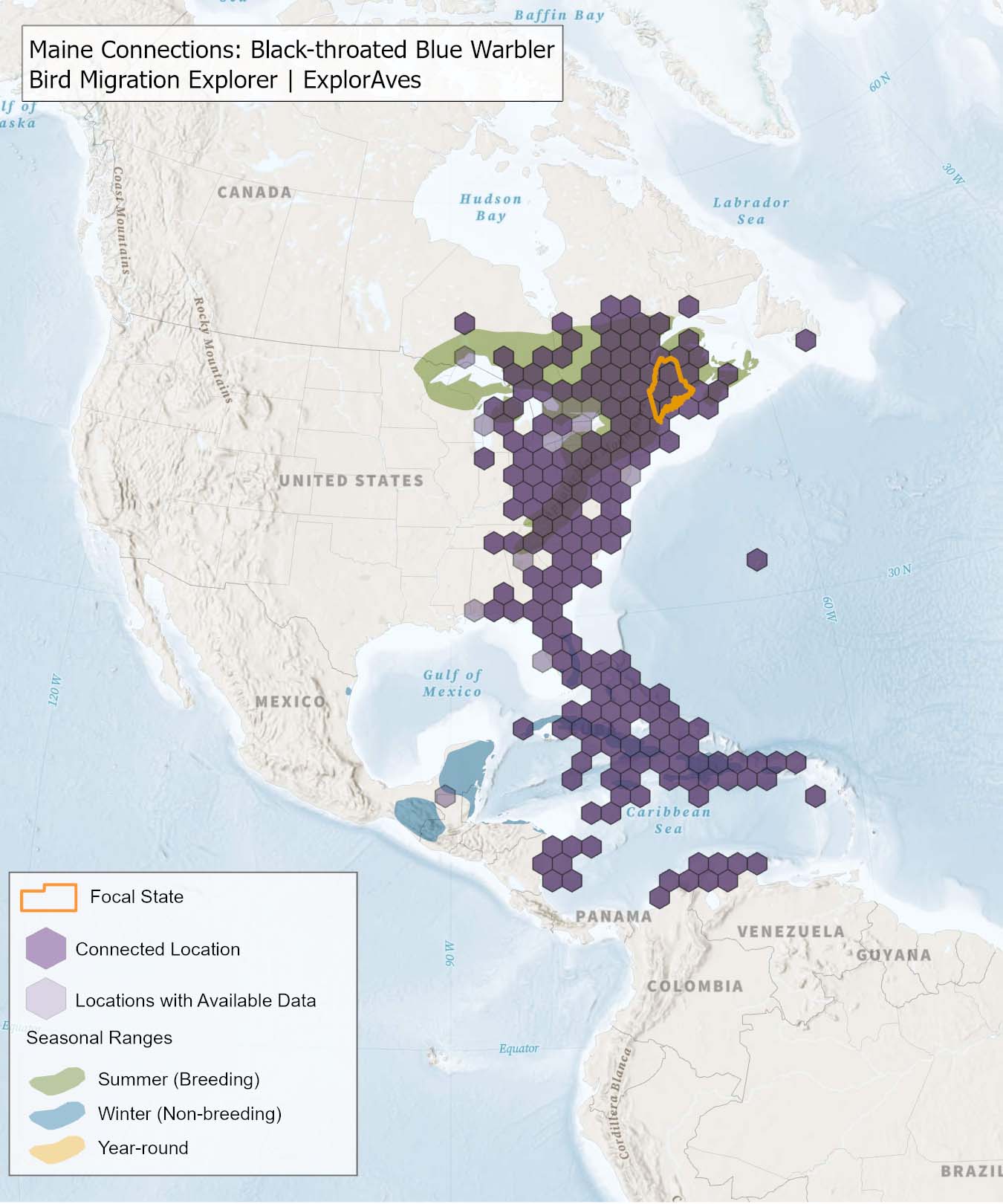 This map shows direct connections between Maine and locations across the hemisphere based on available tagging data for individual Black-throated Blue Warbler's shared by researchers for the Bird Migration Explorer. Data were generously shared by researchers for the Bird Migration Explorer. The map displays the hexagons that are connected to the state (dark purple) as well as hexagons with available tagging data for the species (light purple) with no direct connections to the state. Explore more connections for Black-throated Blue Warbler on the Bird Migration Explorer. Download map.