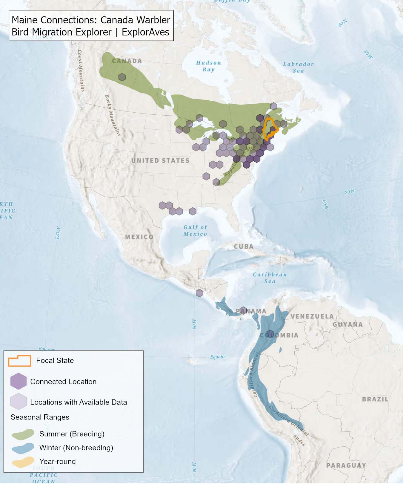 This map shows direct connections between Maine and locations across the hemisphere based on available tagging data for individual Canada Warbler''s shared by researchers for the Bird Migration Explorer. Data were generously shared by researchers for the Bird Migration Explorer. The map displays the hexagons that are connected to the state (dark purple) as well as hexagons with available tagging data for the species (light purple) with no direct connections to the state. Explore more connections for Canada Warbler on the Bird Migration Explorer. Download map.