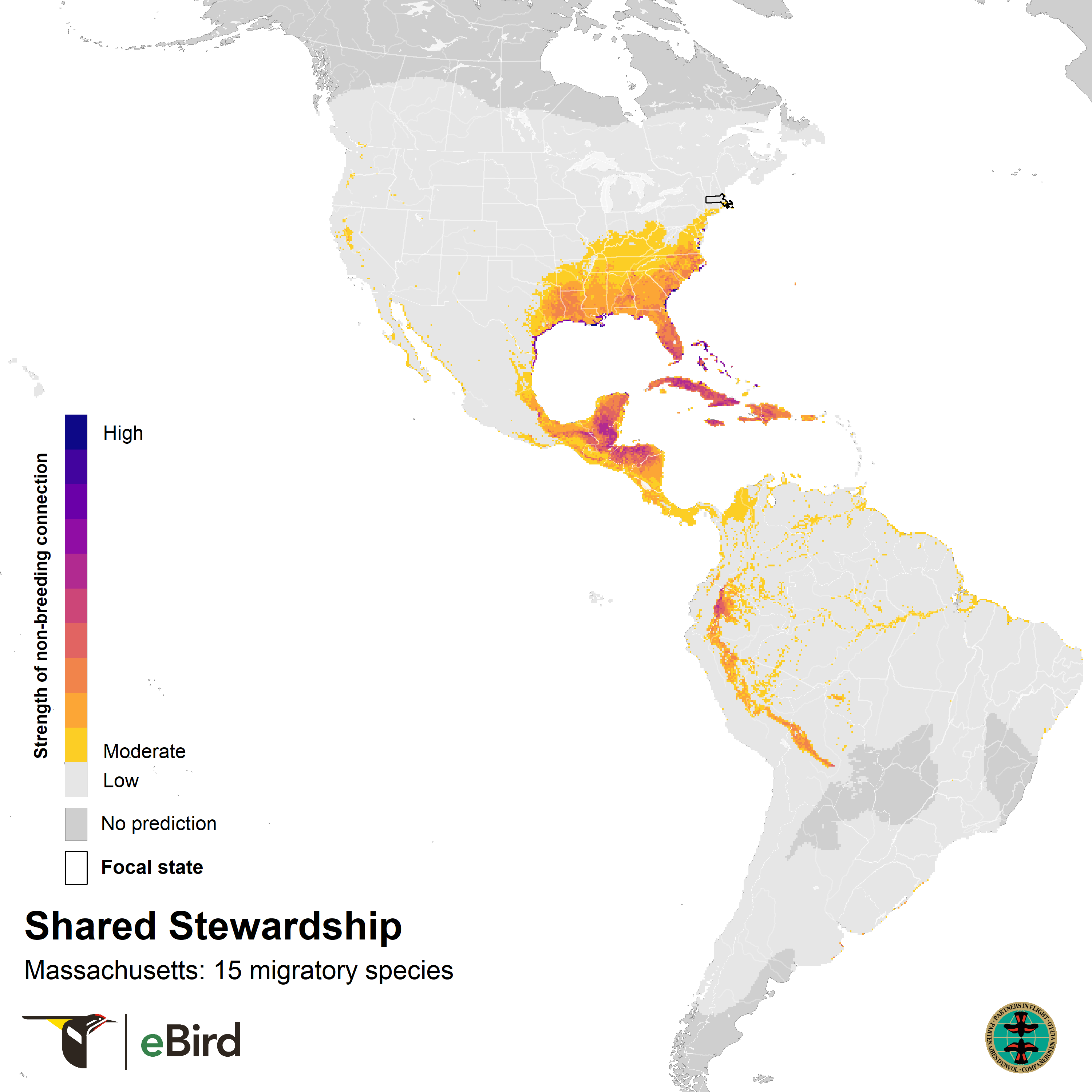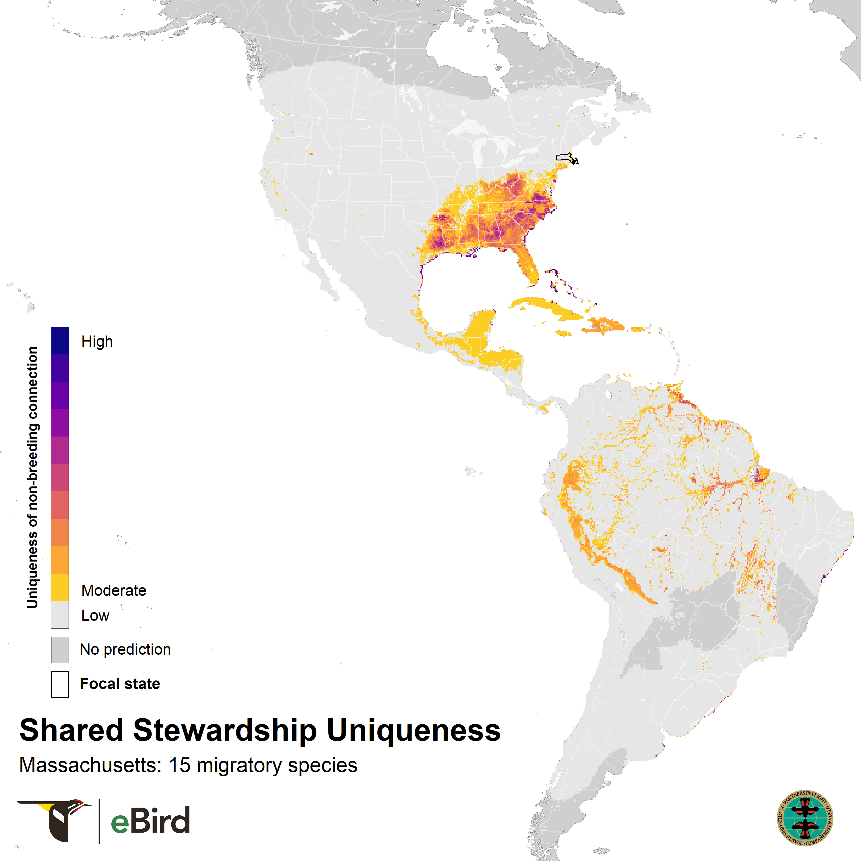 These maps show where 15 migratory species that breed in Massachusetts are concentrated during the nonbreeding season using year-round distribution models from eBird Status and Trends. They highlight opportunities for conservation across the full annual cycle of birds by informing locations for joint stewardship actions. Shared stewardship, on the left, represents the strength of connection between Massachusetts and the nonbreeding distributions of Massachusetts' migratory birds. Shared stewardship uniqueness, on the right, shows this information relative to all 50 states, emphasizing the hotspots where Massachusetts has unique connections compared to other states. The values in each 3 x 3 km pixel combine information on the number of species, the nonbreeding abundances of those species, and the percent of each species’ breeding population in Massachusetts.