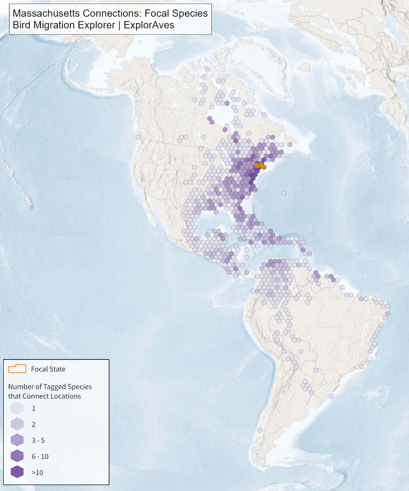 (1) A state-level overview of where the migratory birds that breed in Massachusetts are found during the non-breeding season based on Shared Stewardship Connection Maps.