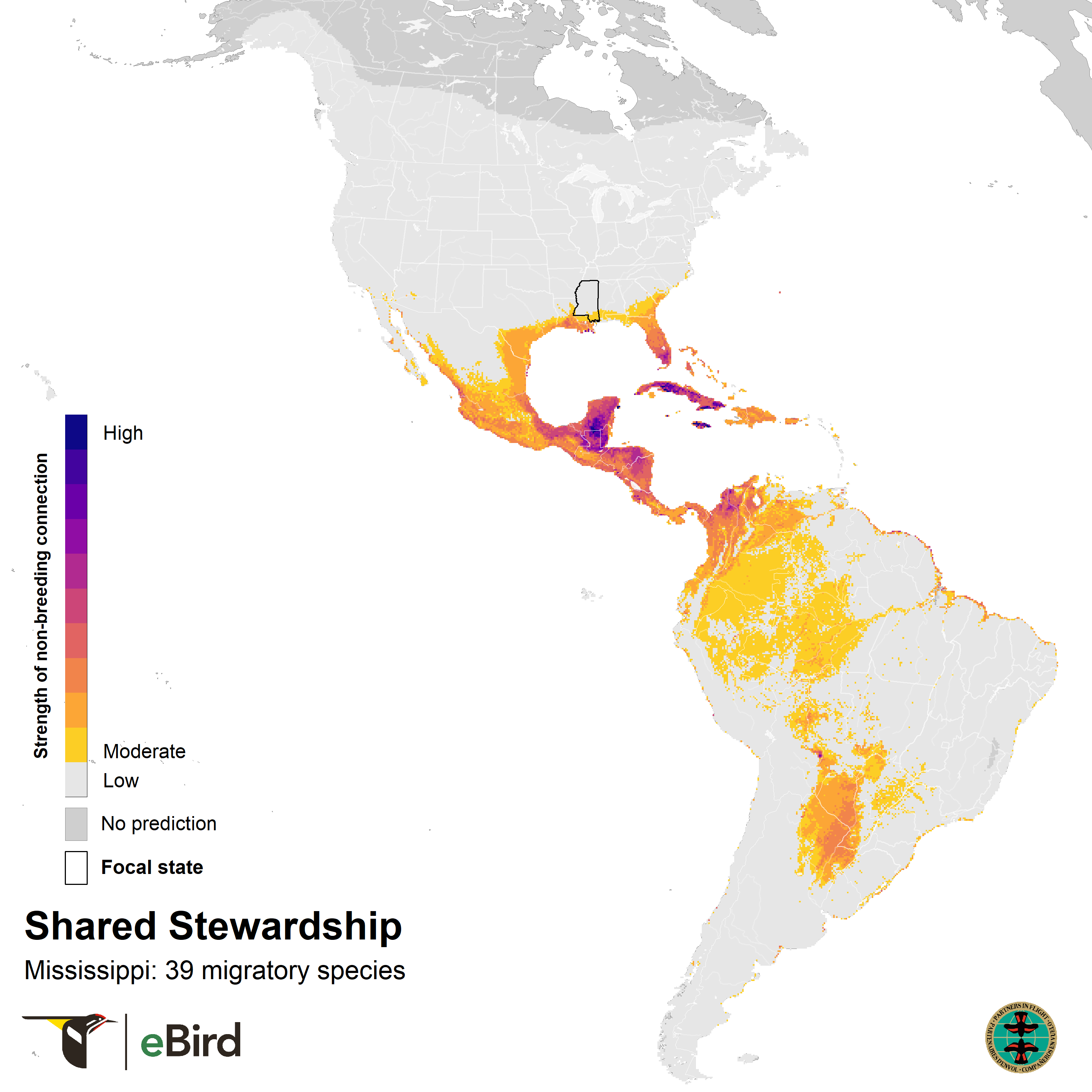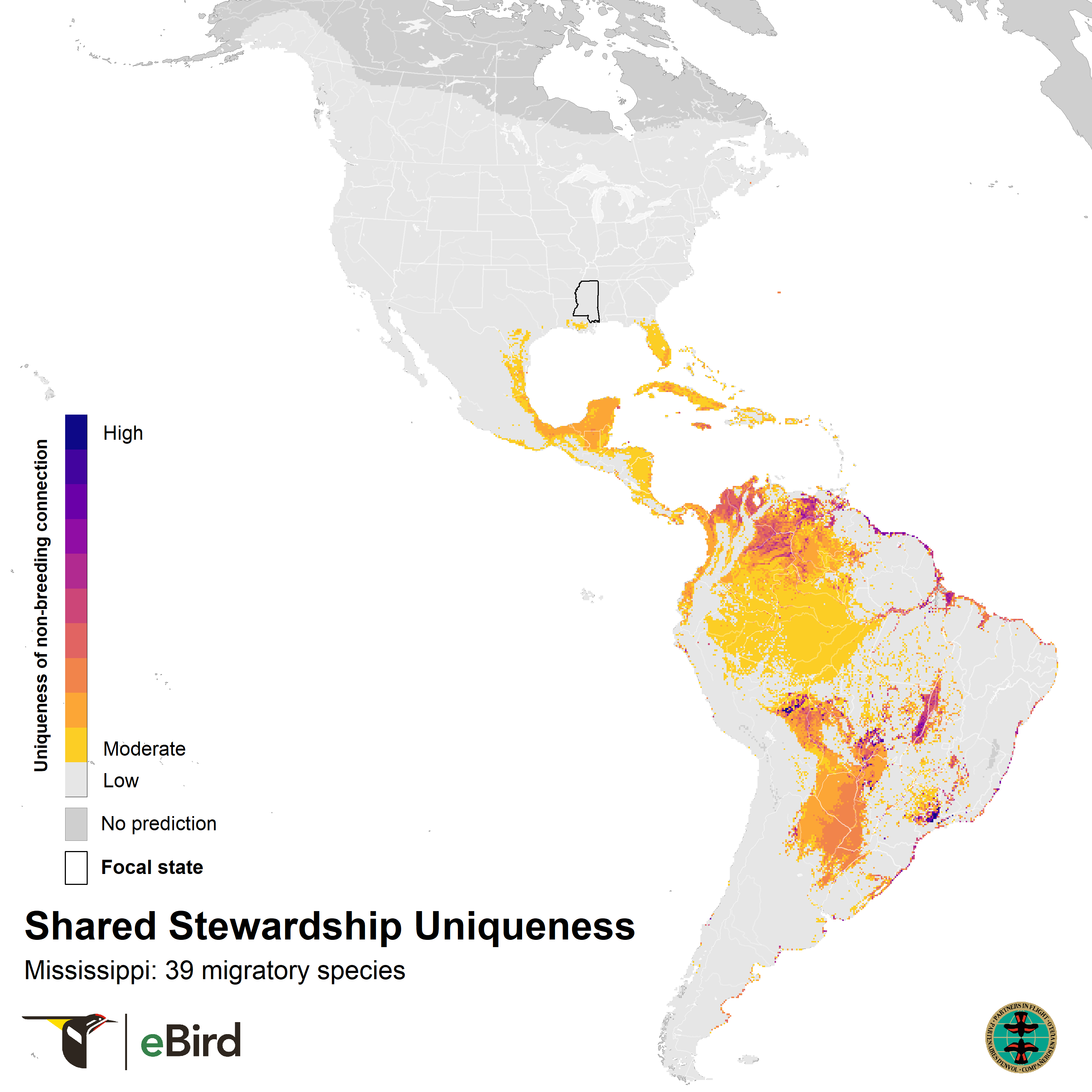 These maps used modeled information on the relative abundance and percent of population of bird species from eBird Status and Trends. Shared Stewardship maps are weighted sums of species’ nonbreeding populations at 3 x 3 km resolution, with the percentage of a species’ breeding population in Mississippi state as the weight. Thus, if a species has a higher percent breeding population in a state, its nonbreeding map will contribute more to that state’s shared stewardship. Shared stewardship uniqueness maps show these values relative to the total connections across all 50 U.S.A. states by calculating the proportion of the total connection strength attributed to Mississippi in each pixel. Download the complete list of species included in this map. For more information visit FAQs and eBird’s portal for state-level summaries.