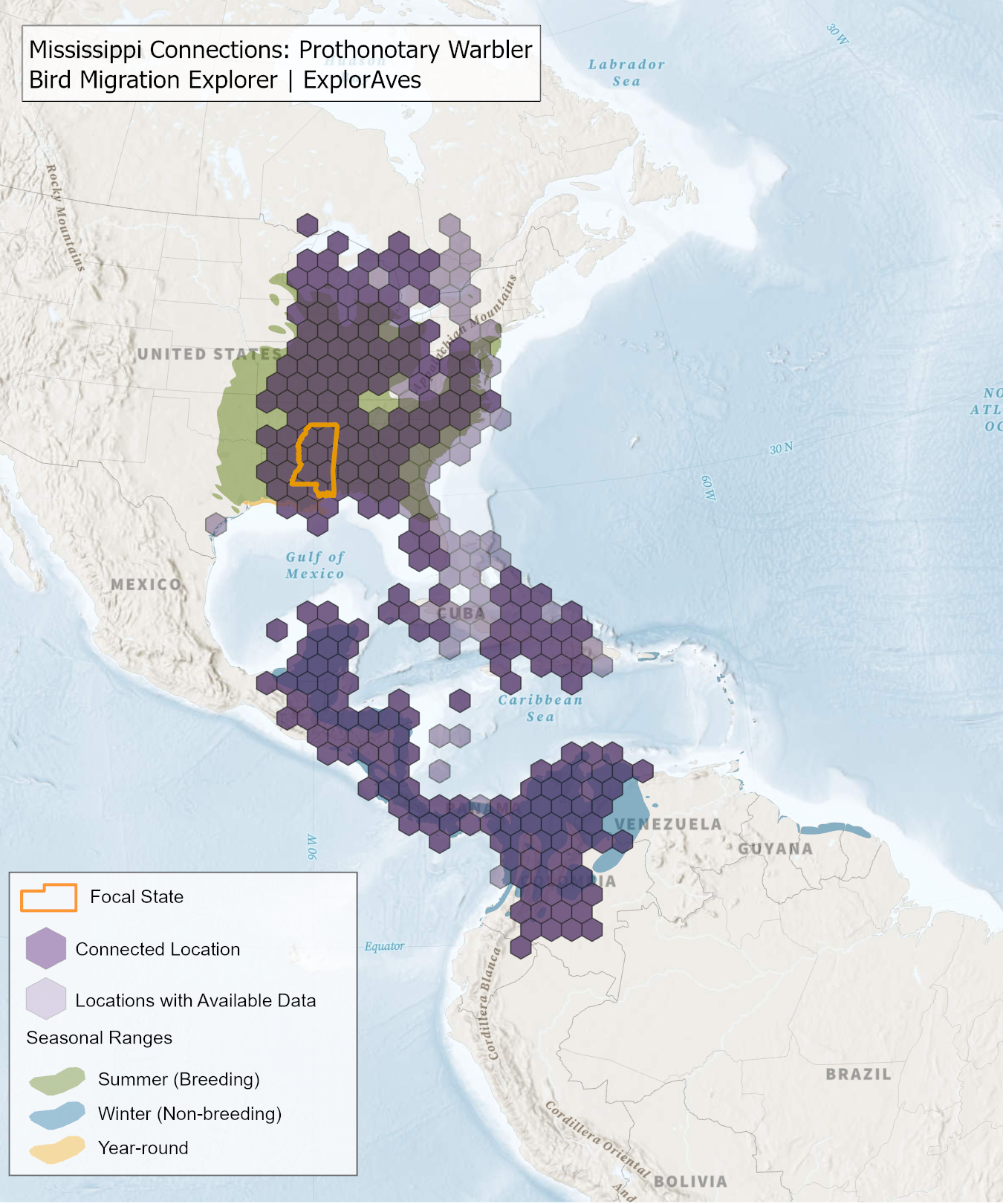 This map shows direct connections between Mississippi and locations across the hemisphere based on available tagging data for individual Prothonotary Warbler shared by researchers for the Bird Migration Explorer. Data were generously shared by researchers for the Bird Migration Explorer. The map displays the hexagons that are connected to the state (dark purple) as well as hexagons with available tagging data for the species (light purple) with no direct connections to the state. Explore more connections for Prothonotary Warbler on the Bird Migration Explorer. Download map.