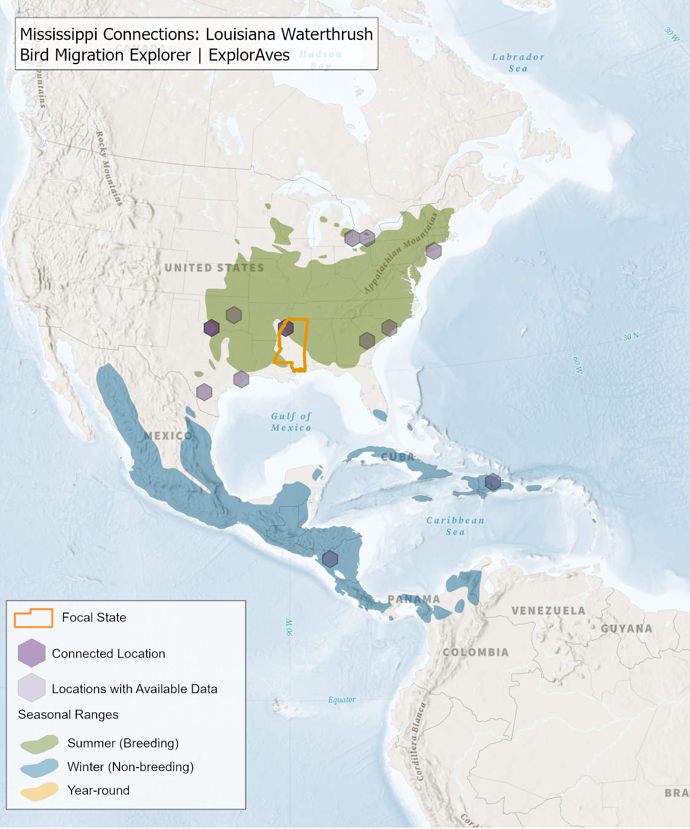 The species connection maps show direct connections between Mississippi and locations across the Western Hemisphere based on tagging data in the Bird Migration Explorer available for each of the state’s migratory species of concern. Connections are based on bird band encounter records, automated radio telemetry, archival geolocators, satellite and GPS tracking, or genetic markers that document the movement of individual birds. The maps display locations (i.e., hexagons) that are connected to Mississippi (polygon outlined orange) and illustrate the need to protect, restore, enhance and manage safe habitat in those areas to ensure species can satisfy their biological requirements across the full annual cycle. As individual birds travel between the species’ summer (breeding) and winter (stationary non-breeding) ranges, they traverse geopolitical boundaries, underscoring the need for collaborative and coordinated conservation efforts to maximize the return on conservation investments for the species in Mississippi. While these maps offer valuable insight, they do not capture the complete picture of all connections, because they only present tagging data available in the Bird Migration Explorer. In some cases, species may not have a connection map, because no tagging data are available.