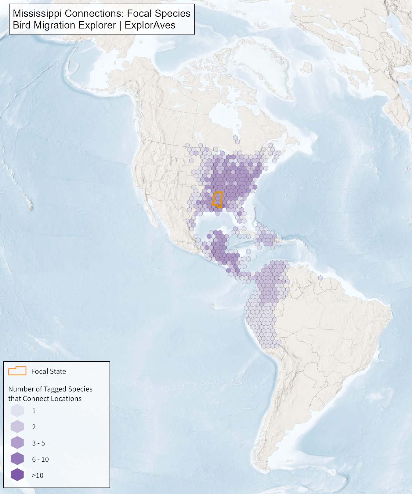 This map shows direct connections between Mississippi and other locations across the Western Hemisphere based on tagging data available in the Bird Migration Explorer for the state’s migratory focal species. Connections are based on bird band encounter records, automated radio telemetry, archival geolocators, satellite and GPS tracking, or genetic markers that document the movement of individual birds. The map displays the number of migratory focal species that connect each location (hexagon) to Mississippi. While these data offer valuable insight, they do not capture the complete picture of all connections because they only present available tagging data for the subset of species of concern identified by each state. The multi-species tagging connections map illustrates the need to protect, restore, enhance and manage safe habitat in locations connected to the state to ensure migratory species can access the resources they need across the full annual cycle. As individual birds travel between species’ summer (breeding) and winter (stationary non-breeding) ranges, they traverse geopolitical boundaries, underscoring the need for coordinated conservation efforts to maximize the return on conservation investments in Mississippi. Additionally, multi-species connection maps illustrate Mississippi's crucial role in safeguarding the migratory movements of these species.
