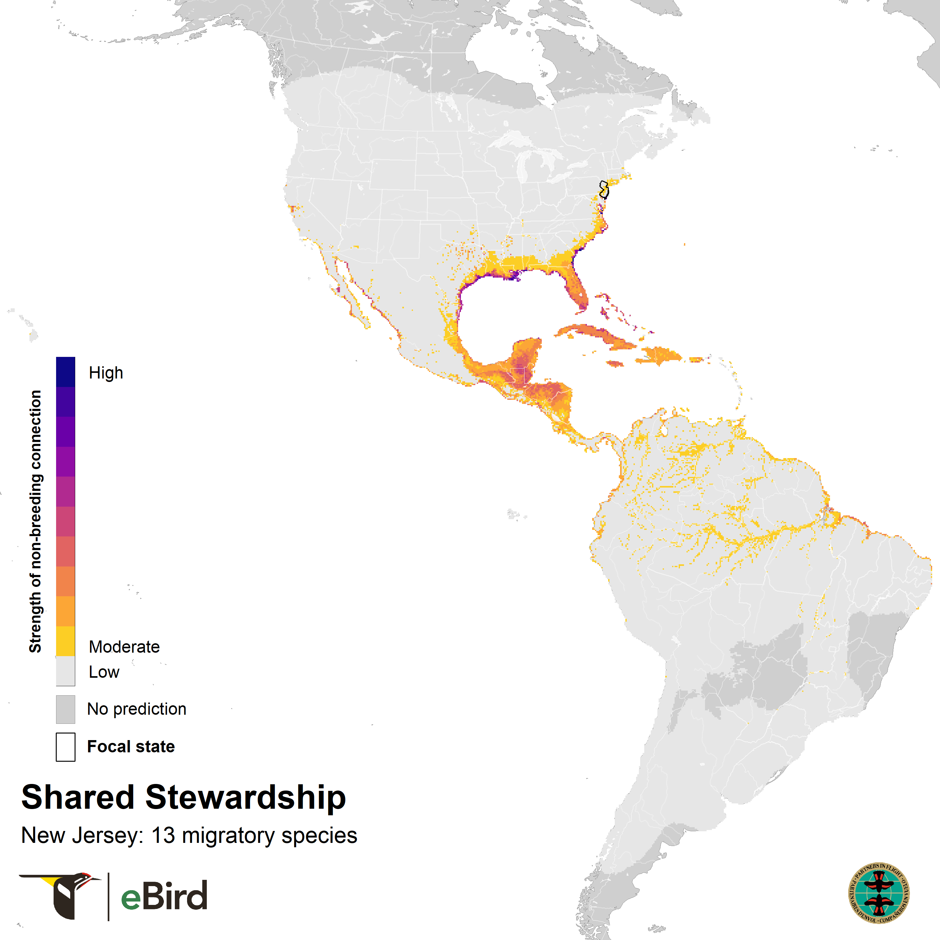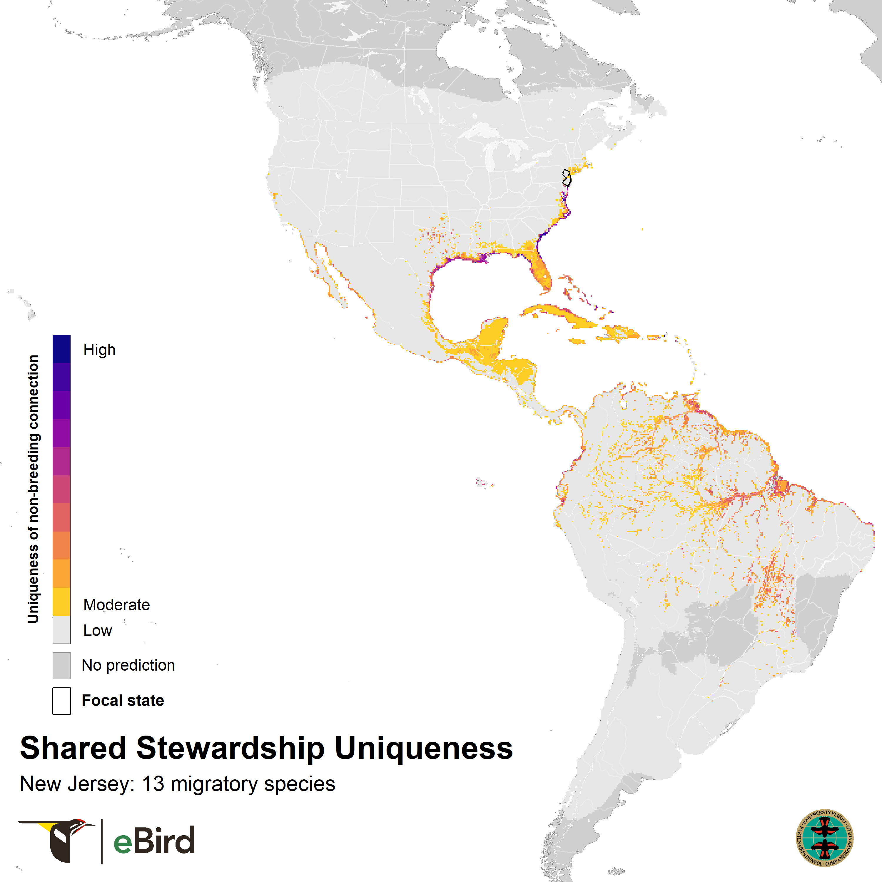 These maps show where 13 migratory species that breed in New Jersey are concentrated during the nonbreeding season using year-round distribution models from eBird Status and Trends. They highlight opportunities for conservation across the full annual cycle of birds by informing locations for joint stewardship actions. Shared stewardship, on the left, represents the strength of connection between New Jersey and the nonbreeding distributions of New Jersey's migratory birds. Shared stewardship uniqueness, on the right, shows this information relative to all 50 states, emphasizing the hotspots where New Jersey has unique connections compared to other states. The values in each 3 x 3 km pixel combine information on the number of species, the nonbreeding abundances of those species, and the percent of each species’ breeding population in New Jersey.
