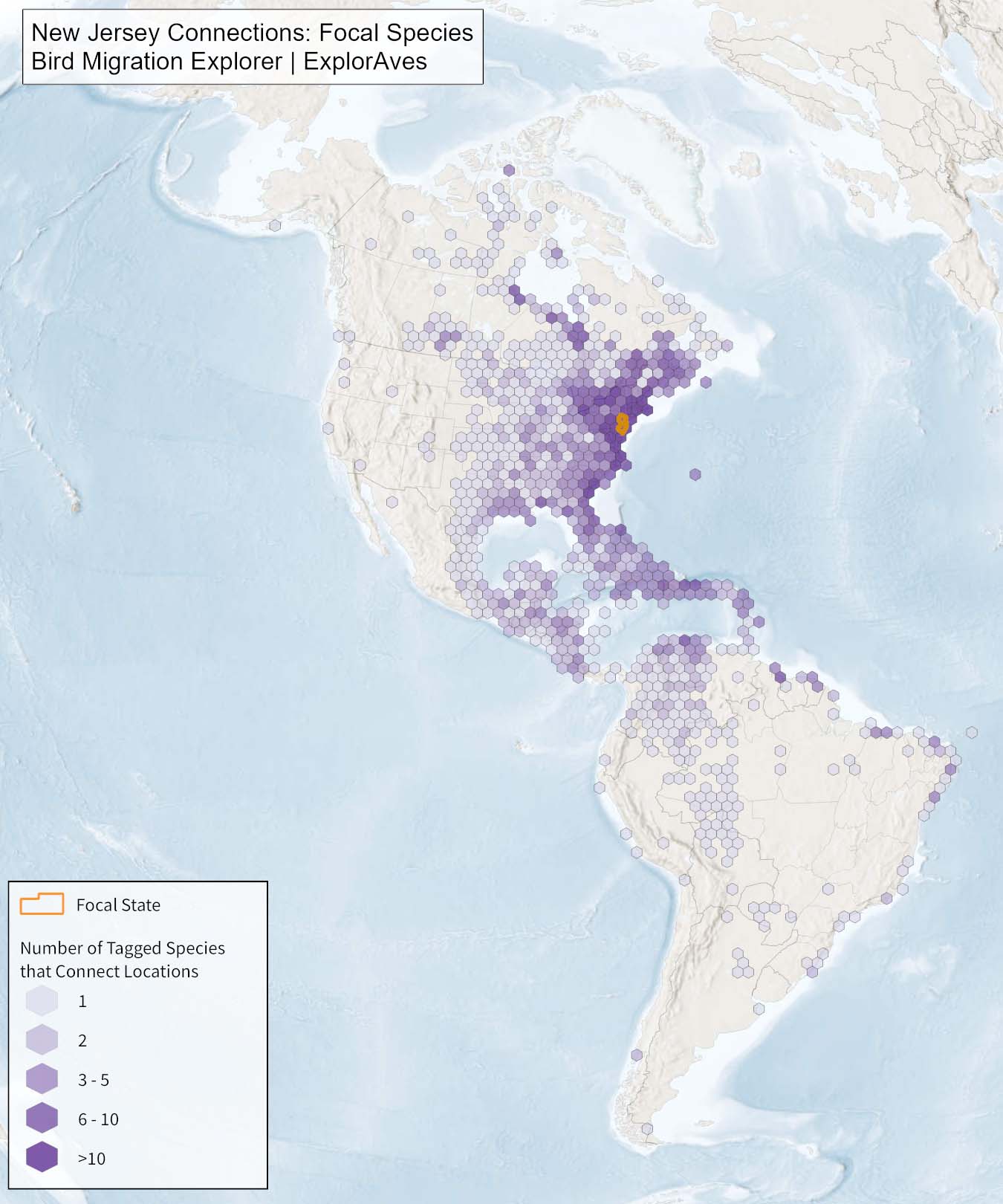 This map shows direct connections between New Jersey and other locations across the Western Hemisphere based on tagging data available in the Bird Migration Explorer for the state’s migratory focal species. Connections are based on bird band encounter records, automated radio telemetry, archival geolocators, satellite and GPS tracking, or genetic markers that document the movement of individual birds. The map displays the number of migratory focal species that connect each location (hexagon) to New Jersey. While these data offer valuable insight, they do not capture the complete picture of all connections because they only present available tagging data for the subset of species of concern identified by each state. The multi-species tagging connections map illustrates the need to protect, restore, enhance and manage safe habitat in locations connected to the state to ensure migratory species can access the resources they need across the full annual cycle. As individual birds travel between species’ summer (breeding) and winter (stationary non-breeding) ranges, they traverse geopolitical boundaries, underscoring the need for coordinated conservation efforts to maximize the return on conservation investments in New Jersey. Additionally, multi-species connection maps illustrate New Jersey's crucial role in safeguarding the migratory movements of these species.