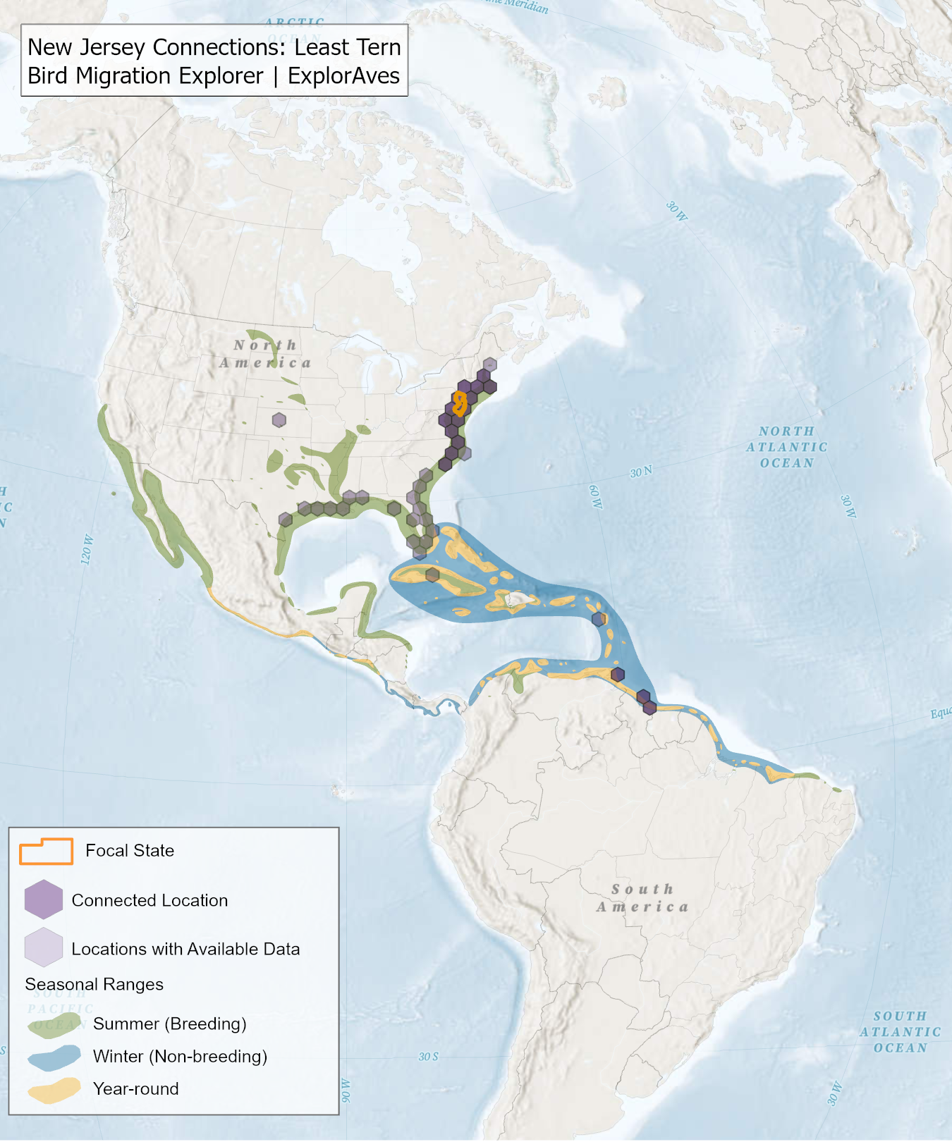 This map shows direct connections between New Jersey and locations across the hemisphere based on available tagging data for individual Least Tern shared by researchers for the Bird Migration Explorer. Data were generously shared by researchers for the Bird Migration Explorer. The map displays the hexagons that are connected to the state (dark purple) as well as hexagons with available tagging data for the species (light purple) with no direct connections to the state. Explore more connections for Least Tern on the Bird Migration Explorer. Download map.