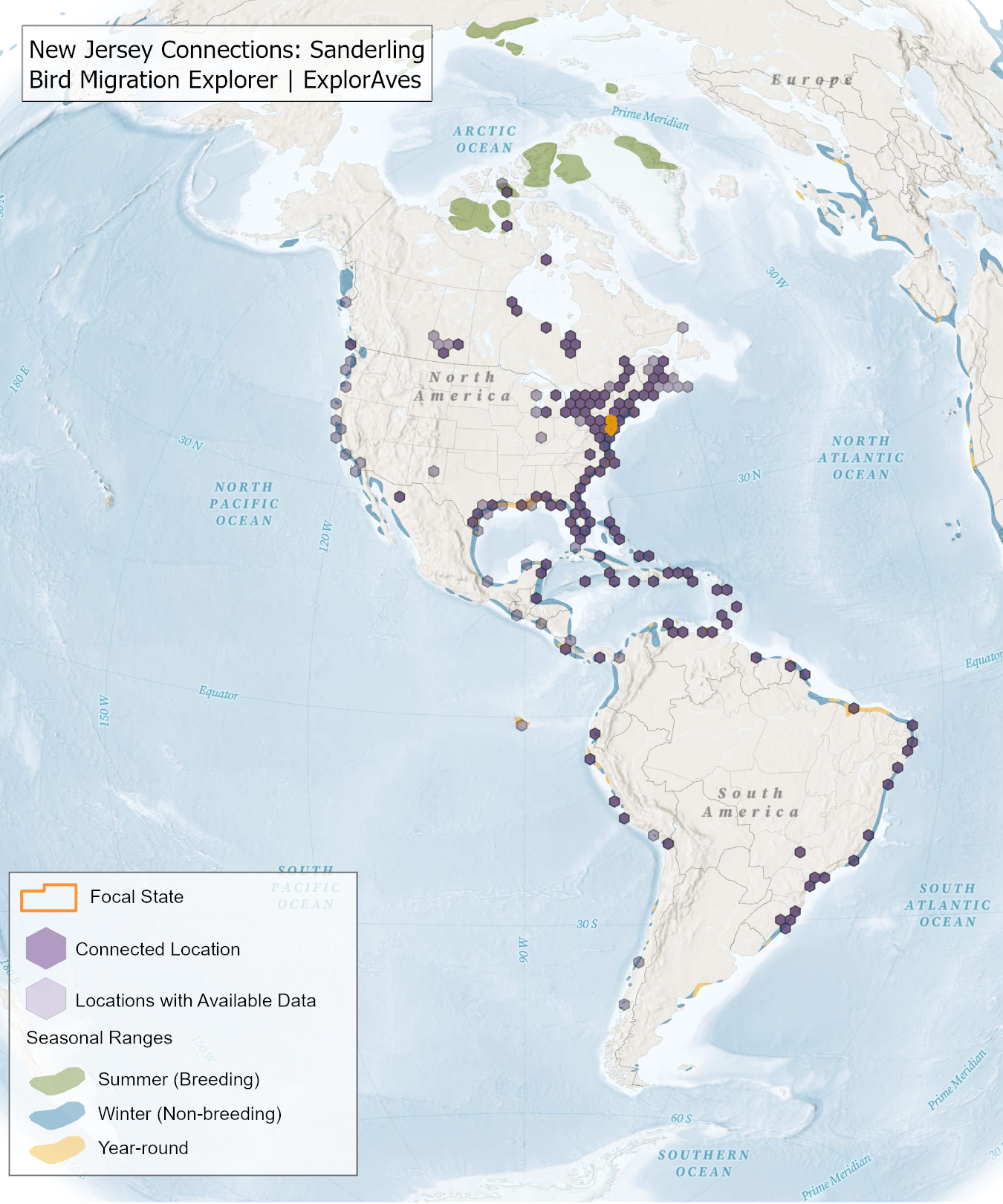 This map shows direct connections between New Jersey and locations across the hemisphere based on available tagging data for individual Sanderling shared by researchers for the Bird Migration Explorer. Data were generously shared by researchers for the Bird Migration Explorer. The map displays the hexagons that are connected to the state (dark purple) as well as hexagons with available tagging data for the species (light purple) with no direct connections to the state. Explore more connections for Sanderling on the Bird Migration Explorer. Download map.