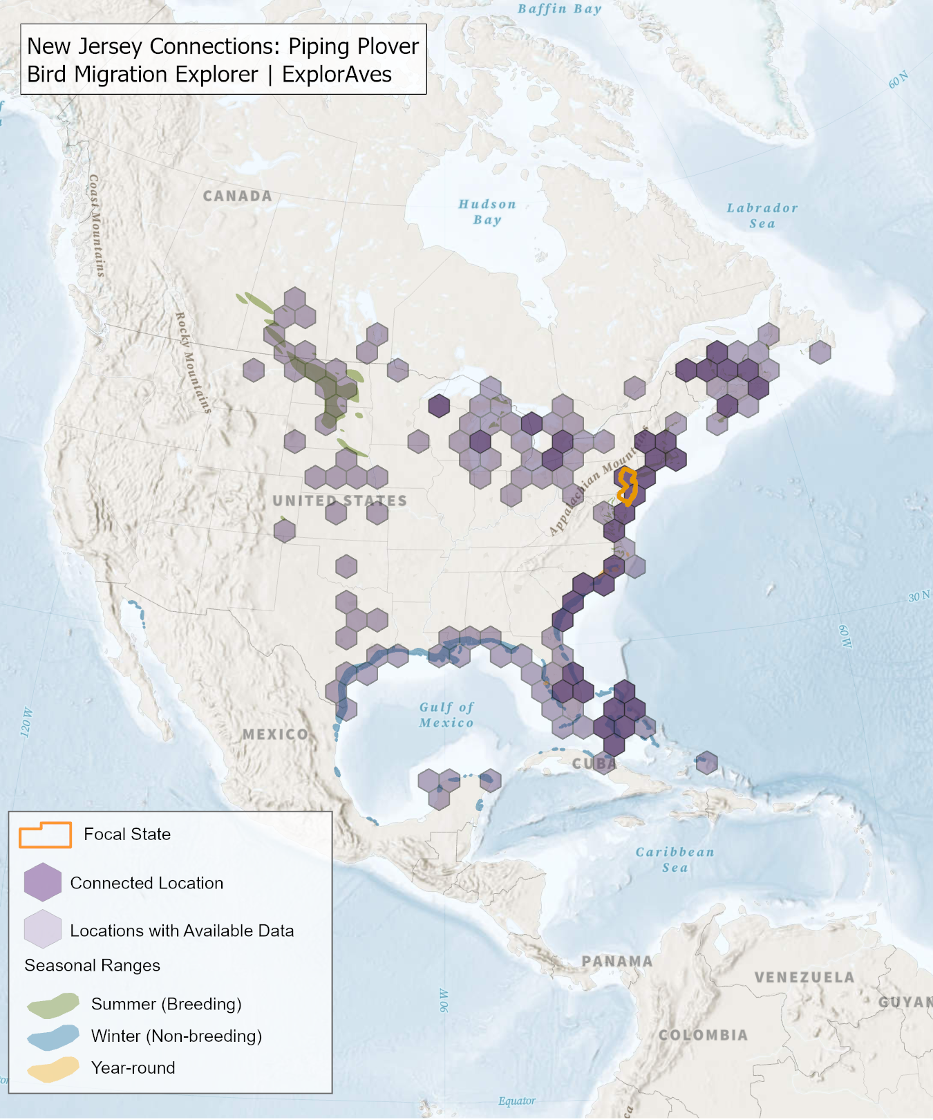 This map shows direct connections between New Jersey and locations across the hemisphere based on available tagging data for individual Piping Plover shared by researchers for the Bird Migration Explorer. Data were generously shared by researchers for the Bird Migration Explorer. The map displays the hexagons that are connected to the state (dark purple) as well as hexagons with available tagging data for the species (light purple) with no direct connections to the state. Explore more connections for Piping Plover on the Bird Migration Explorer. Download map.