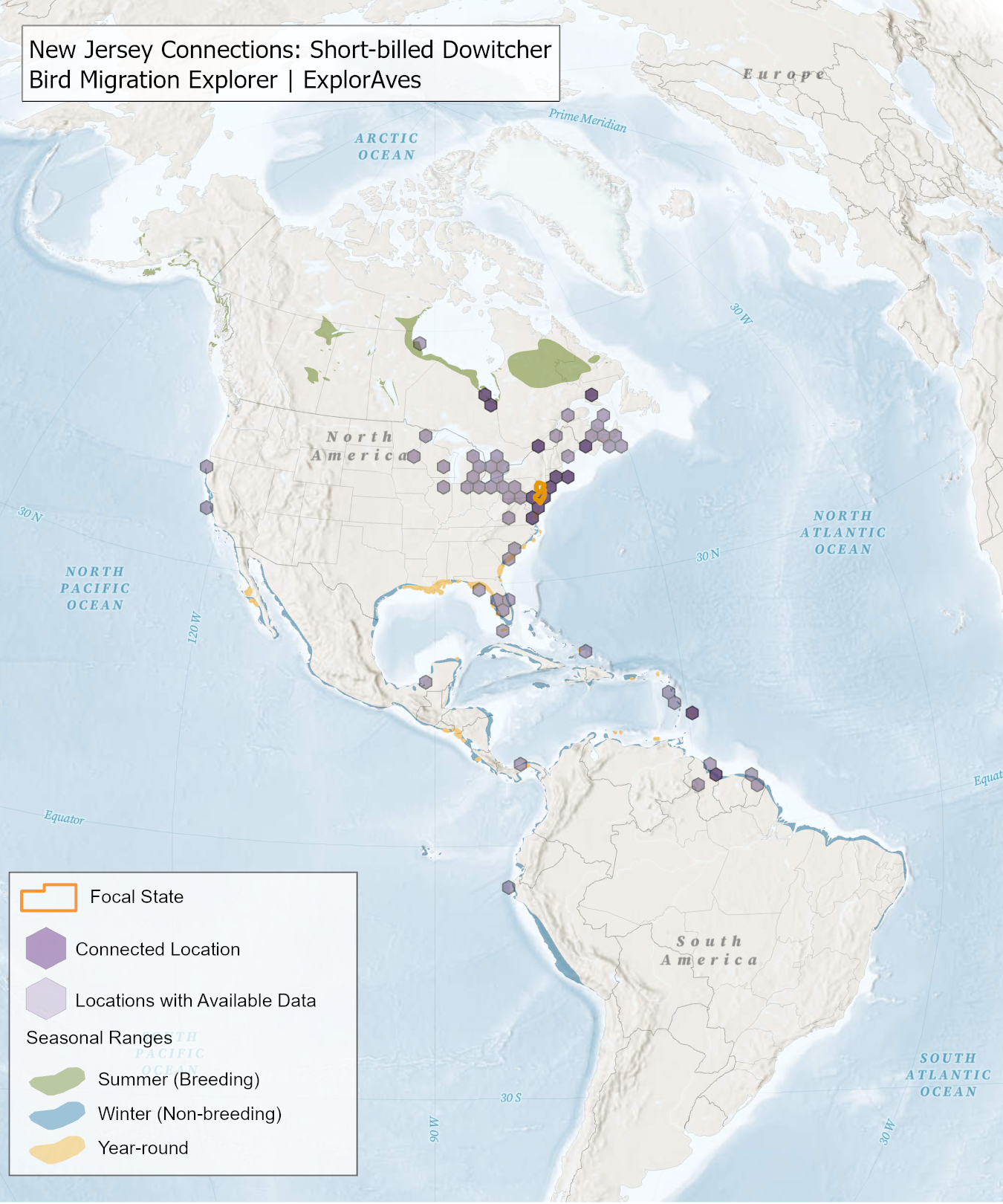 This map shows direct connections between New Jersey and locations across the hemisphere based on available tagging data for individual Short-billed Dowitcher shared by researchers for the Bird Migration Explorer. Data were generously shared by researchers for the Bird Migration Explorer. The map displays the hexagons that are connected to the state (dark purple) as well as hexagons with available tagging data for the species (light purple) with no direct connections to the state. Explore more connections for Short-billed Dowitcher on the Bird Migration Explorer. Download map.