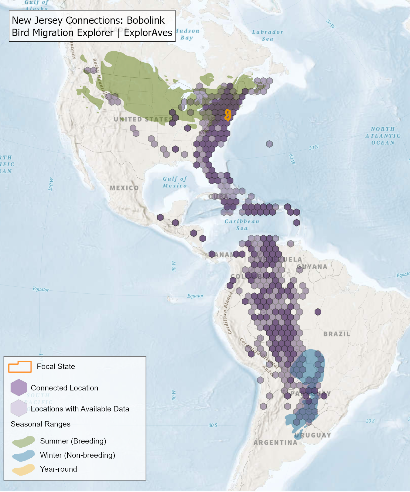 The species connection maps show direct connections between New Jersey and locations across the Western Hemisphere based on tagging data in the Bird Migration Explorer available for each of the state’s migratory species of concern. Connections are based on bird band encounter records, automated radio telemetry, archival geolocators, satellite and GPS tracking, or genetic markers that document the movement of individual birds. The maps display locations (i.e., hexagons) that are connected to New Jersey (polygon outlined orange) and illustrate the need to protect, restore, enhance and manage safe habitat in those areas to ensure species can satisfy their biological requirements across the full annual cycle. As individual birds travel between the species’ summer (breeding) and winter (stationary non-breeding) ranges, they traverse geopolitical boundaries, underscoring the need for collaborative and coordinated conservation efforts to maximize the return on conservation investments for the species in New Jersey. While these maps offer valuable insight, they do not capture the complete picture of all connections, because they only present tagging data available in the Bird Migration Explorer. In some cases, species may not have a connection map, because no tagging data are available.