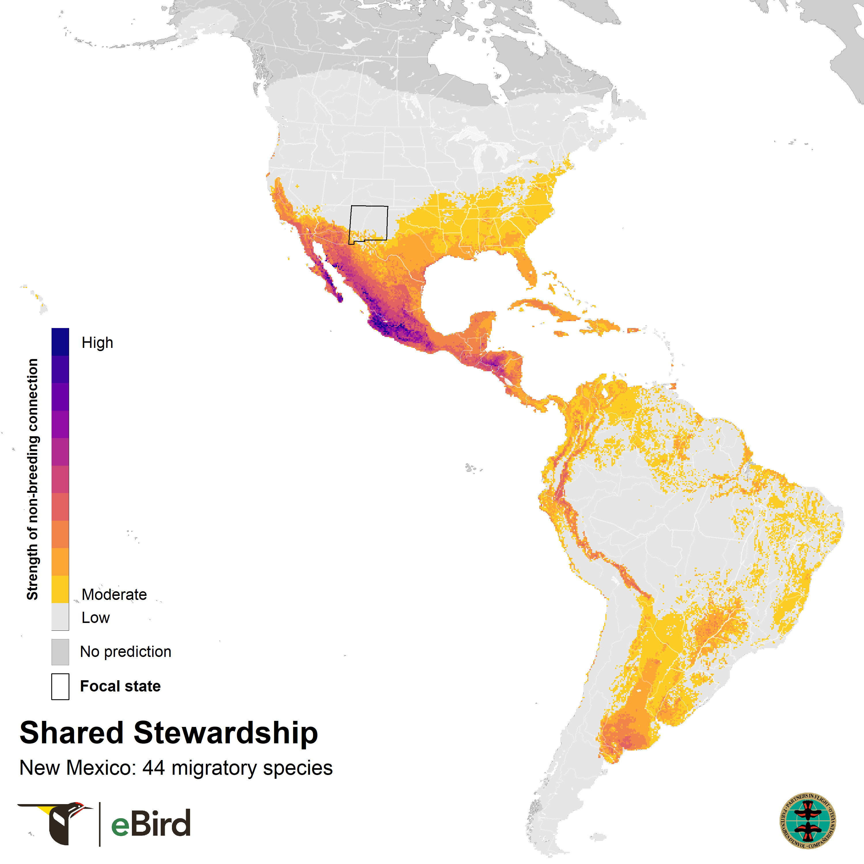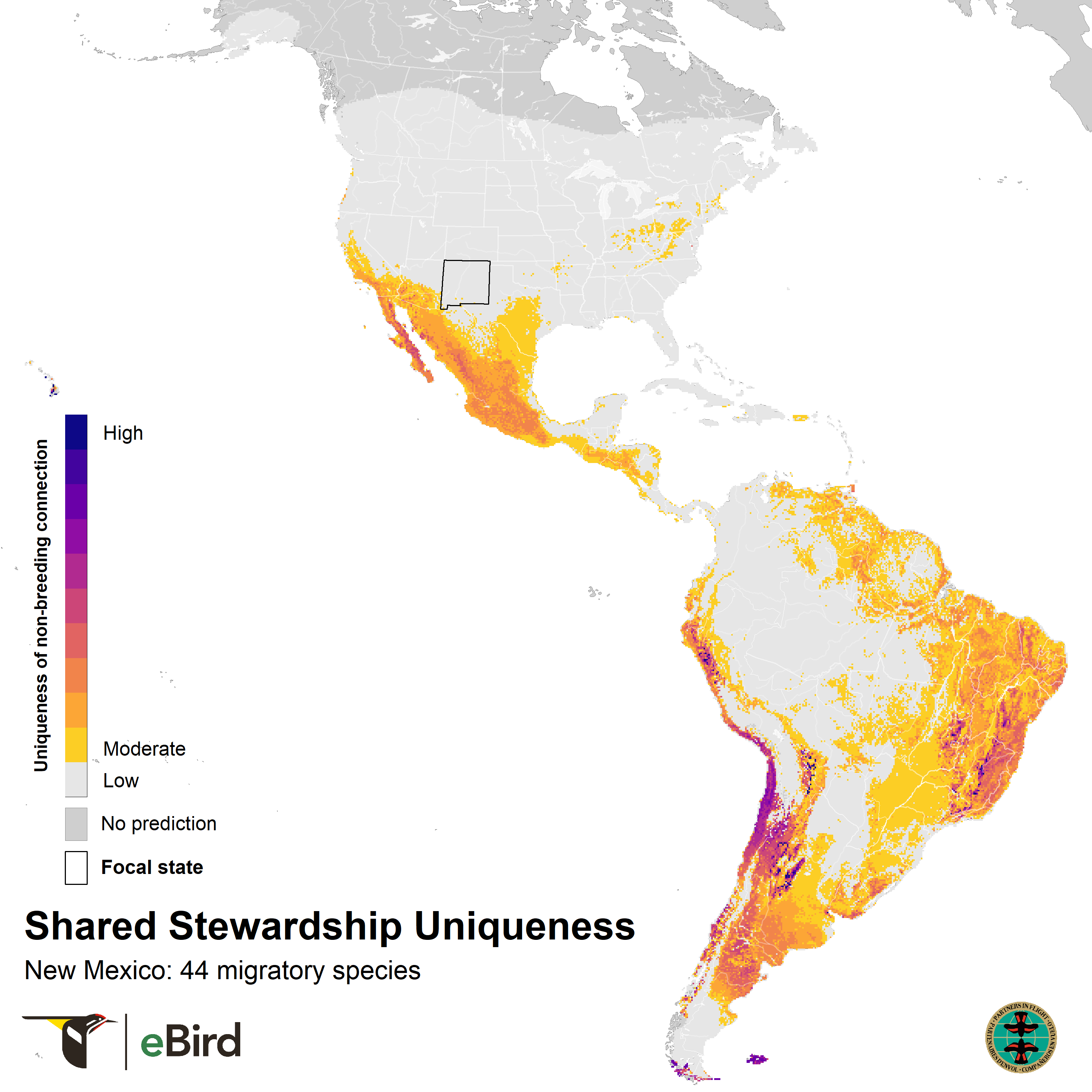 These maps used modeled information on the relative abundance and percent of population of bird species from eBird Status and Trends. Shared Stewardship maps are weighted sums of species’ nonbreeding populations at 3 x 3 km resolution, with the percentage of a species’ breeding population in New Mexico state as the weight. Thus, if a species has a higher percent breeding population in a state, its nonbreeding map will contribute more to that state’s shared stewardship. Shared stewardship uniqueness maps show these values relative to the total connections across all 50 U.S.A. states by calculating the proportion of the total connection strength attributed to New Mexico in each pixel. Download the complete list of species included in this map. For more information visit FAQs and eBird’s portal for state-level summaries.
