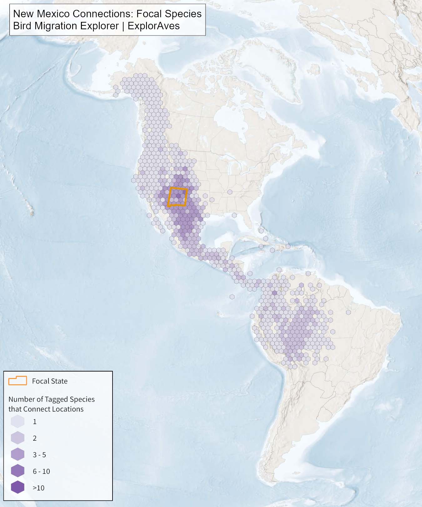 This map shows direct connections between New Mexico and other locations across the Western Hemisphere based on tagging data available in the Bird Migration Explorer for the state’s migratory focal species. Connections are based on bird band encounter records, automated radio telemetry, archival geolocators, satellite and GPS tracking, or genetic markers that document the movement of individual birds. The map displays the number of migratory focal species that connect each location (hexagon) to New Mexico. While these data offer valuable insight, they do not capture the complete picture of all connections because they only present available tagging data for the subset of species of concern identified by each state. The multi-species tagging connections map illustrates the need to protect, restore, enhance and manage safe habitat in locations connected to the state to ensure migratory species can access the resources they need across the full annual cycle. As individual birds travel between species’ summer (breeding) and winter (stationary non-breeding) ranges, they traverse geopolitical boundaries, underscoring the need for coordinated conservation efforts to maximize the return on conservation investments in New Mexico. Additionally, multi-species connection maps illustrate New Mexico's crucial role in safeguarding the migratory movements of these species.