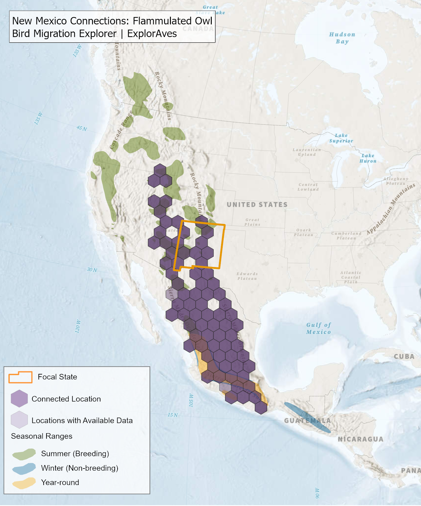 This map shows direct connections between New Mexico and locations across the hemisphere based on available tagging data for individual Flammulated Owl shared by researchers for the Bird Migration Explorer. Data were generously shared by researchers for the Bird Migration Explorer. The map displays the hexagons that are connected to the state (dark purple) as well as hexagons with available tagging data for the species (light purple) with no direct connections to the state. Explore more connections for Flammulated Owl on the Bird Migration Explorer. Download map.