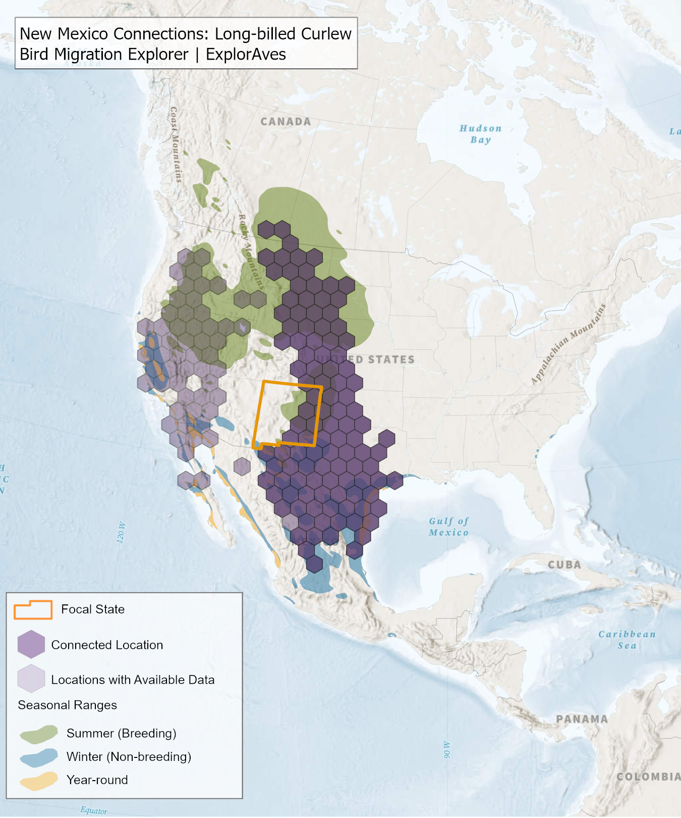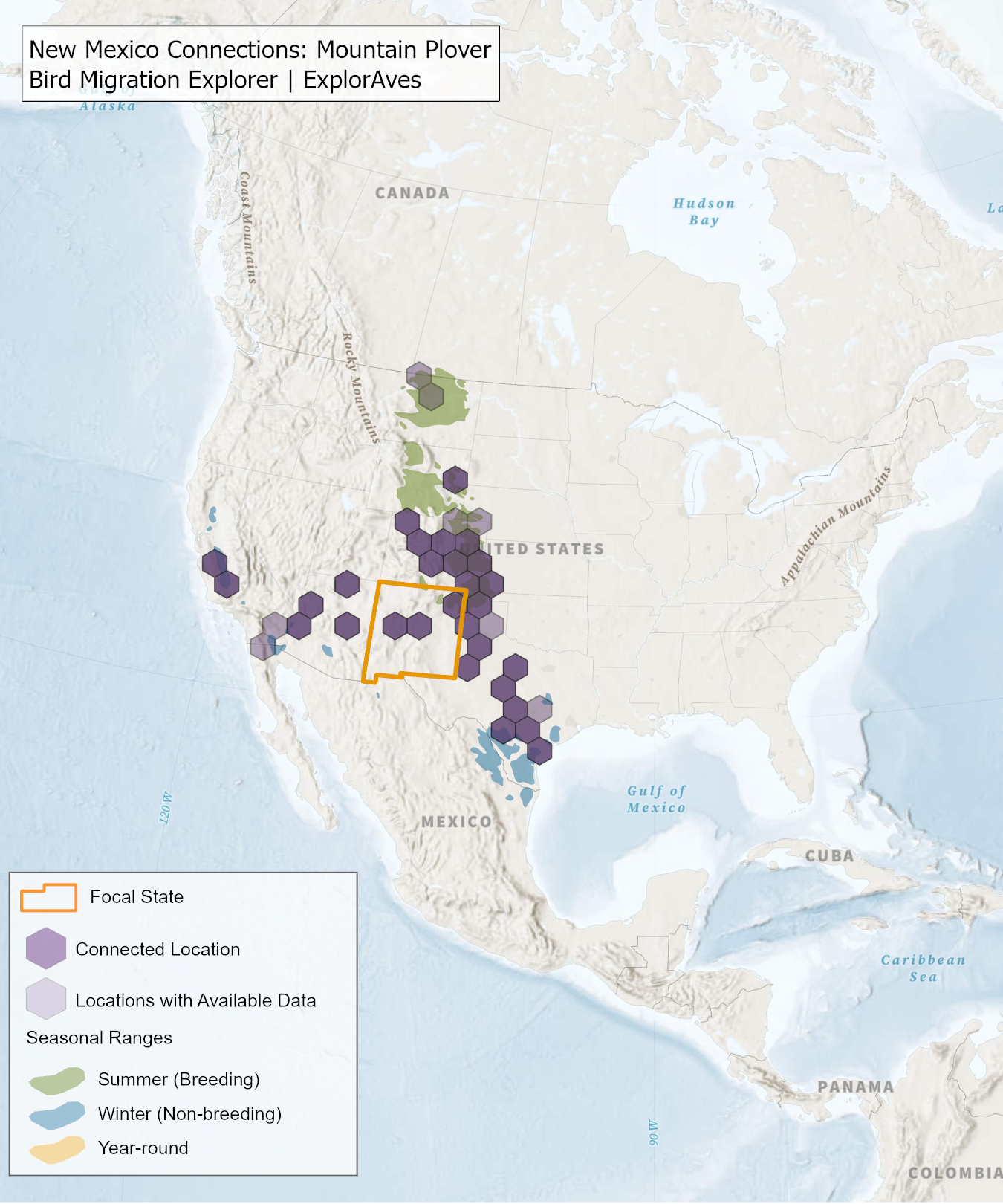 The species connection maps show direct connections between New Mexico and locations across the Western Hemisphere based on tagging data in the Bird Migration Explorer available for each of the state’s migratory species of concern. Connections are based on bird band encounter records, automated radio telemetry, archival geolocators, satellite and GPS tracking, or genetic markers that document the movement of individual birds. The maps display locations (i.e., hexagons) that are connected to New Mexico (polygon outlined orange) and illustrate the need to protect, restore, enhance and manage safe habitat in those areas to ensure species can satisfy their biological requirements across the full annual cycle. As individual birds travel between the species’ summer (breeding) and winter (stationary non-breeding) ranges, they traverse geopolitical boundaries, underscoring the need for collaborative and coordinated conservation efforts to maximize the return on conservation investments for the species in New Mexico. While these maps offer valuable insight, they do not capture the complete picture of all connections, because they only present tagging data available in the Bird Migration Explorer. In some cases, species may not have a connection map, because no tagging data are available.